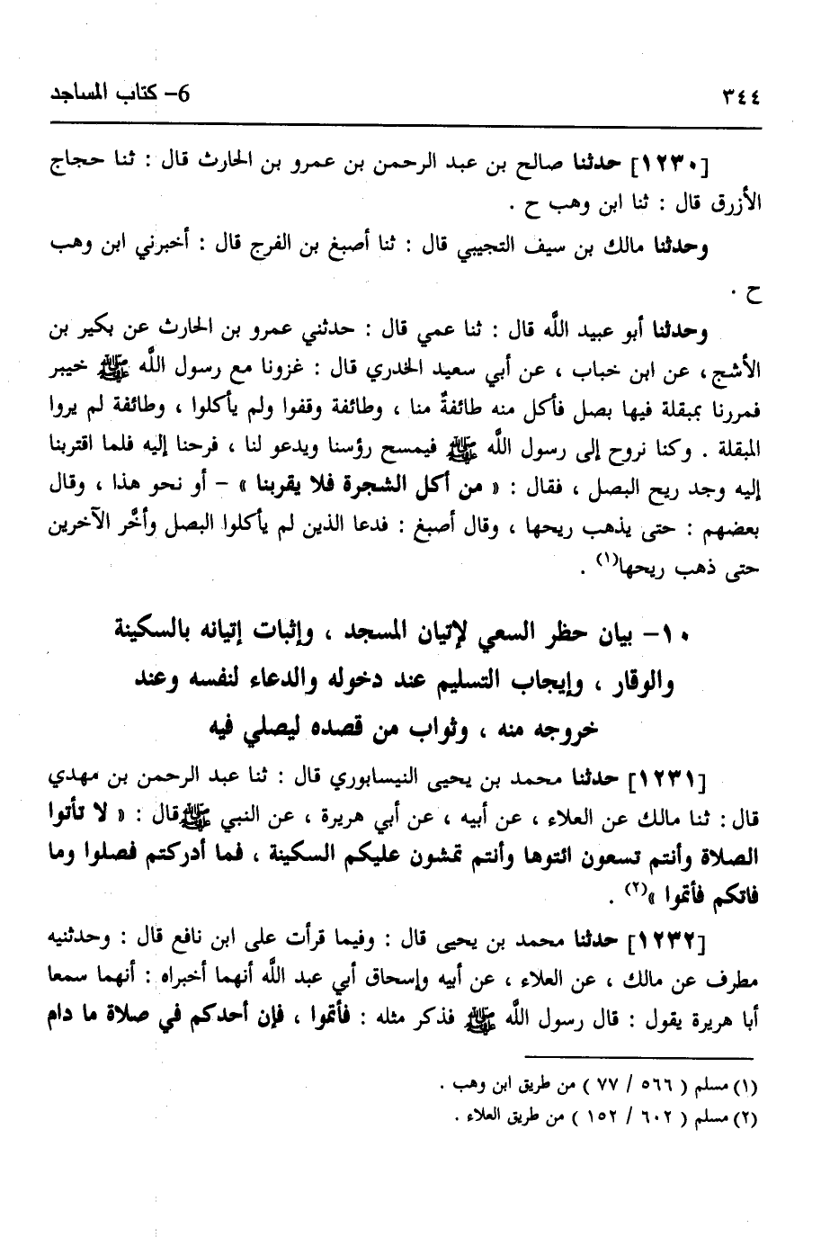 1231 - حَدَّثَنَا مُحَمَّدُ بْنُ يَحْيَى النَّيْسَابُورِيُّ قَالَ: ثَنَا عَبْدُ الرَّحْمَنِ بْنُ مَهْدِيٍّ قَالَ: ثَنَا مَالِكٌ، عَنِ الْعَلَاءِ، عَنْ أَبِيهِ، عَنْ أَبِي هُرَيْرَةَ، عَنِ النَّبِيِّ صَلَّى اللهُ عَلَيْهِ وَسَلَّمَ قَالَ: «§لَا تَأْتُوا الصَّلَاةَ وَأَنْتُمْ تَسْعَوْنَ، ائْتُوهَا وَأَنْتُمْ تَمْشُونَ عَلَيْكُمُ السَّكِينَةُ، فَمَا أَدْرَكْتُمْ فَصَلُّوا وَمَا فَاتَكُمْ فَأَتِمُّوا»