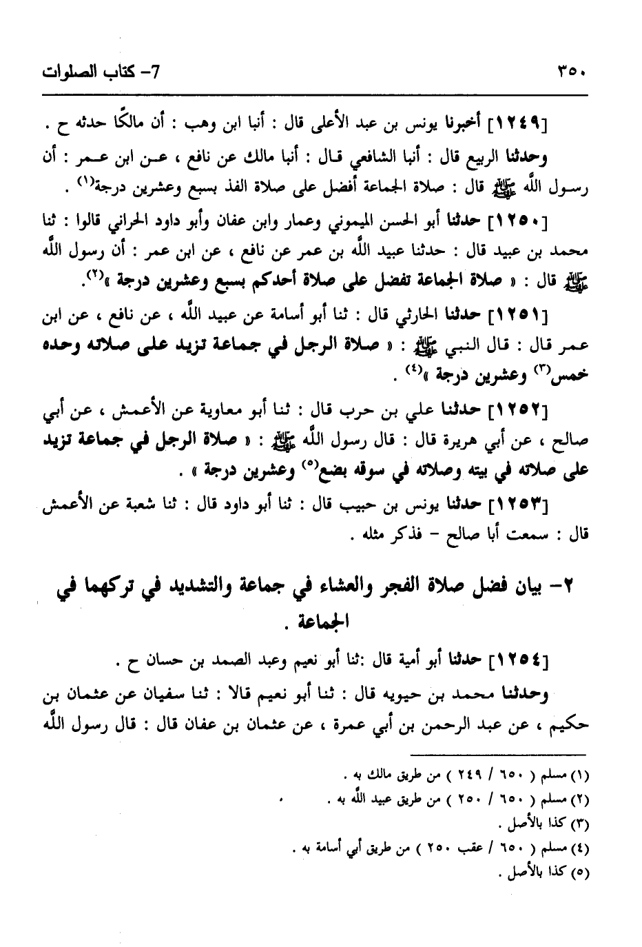 1250 - حَدَّثَنَا أَبُو الْحَسَنِ الْمَيْمُونِيُّ، وَعَمَّارٌ، وَابْنُ عَفَّانَ، وَأَبُو دَاوُدَ الْحَرَّانِيُّ قَالُوا: ثَنَا مُحَمَّدُ بْنُ عُبَيْدٍ قَالَ: حَدَّثَنَا عُبَيْدُ اللَّهِ بْنُ عُمَرَ، عَنْ نَافِعٍ، عَنِ ابْنِ عُمَرَ، أَنَّ رَسُولَ اللَّهِ صَلَّى اللهُ عَلَيْهِ وَسَلَّمَ قَالَ: «§صَلَاةُ الْجَمَاعَةِ تَفْضُلُ عَلَى صَلَاةِ أَحَدِكُمْ بِسَبْعٍ وَعِشْرِينَ دَرَجَةً»