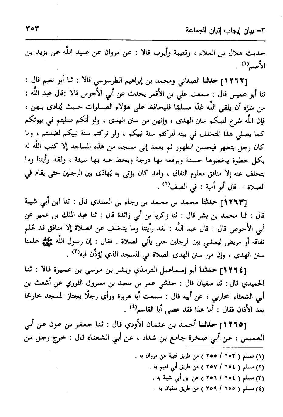 1263 - حَدَّثَنَا مُحَمَّدُ بْنُ مُحَمَّدِ بْنِ رَجَاءِ بْنِ السِّنْدِيِّ قَالَ: ثَنَا ابْنُ أَبِي شَيْبَةَ قَالَ: ثَنَا مُحَمَّدُ بْنُ بِشْرٍ قَالَ: ثَنَا زَكَرِيَّا بْنُ أَبِي زَائِدَةَ قَالَ: ثَنَا عَبْدُ الْمَلِكِ بْنُ عُمَيْرٍ، عَنْ أَبِي الْأَحْوَصِ قَالَ: قَالَ عَبْدُ اللَّهِ: لَقَدْ رَأَيْتُنَا وَمَا يَتَخَلَّفُ عَنِ الصَّلَاةِ إِلَّا مُنَافِقٌ قَدْ عُلِمَ نِفَاقُهُ أَوْ مَرِيضٌ لَيَمْشِي بَيْنَ الرَّجُلَيْنِ حَتَّى يَأْتِيَ الصَّلَاةَ، فَقَالَ: «إِنَّ رَسُولَ اللَّهِ صَلَّى اللهُ عَلَيْهِ وَسَلَّمَ §عَلَّمَنَا سُنَنَ الْهُدَى، وَإِنَّ مِنْ سُنَنِ الْهُدَى الصَّلَاةَ فِي الْمَسْجِدِ الَّذِي يُؤَذَّنُ فِيهِ»