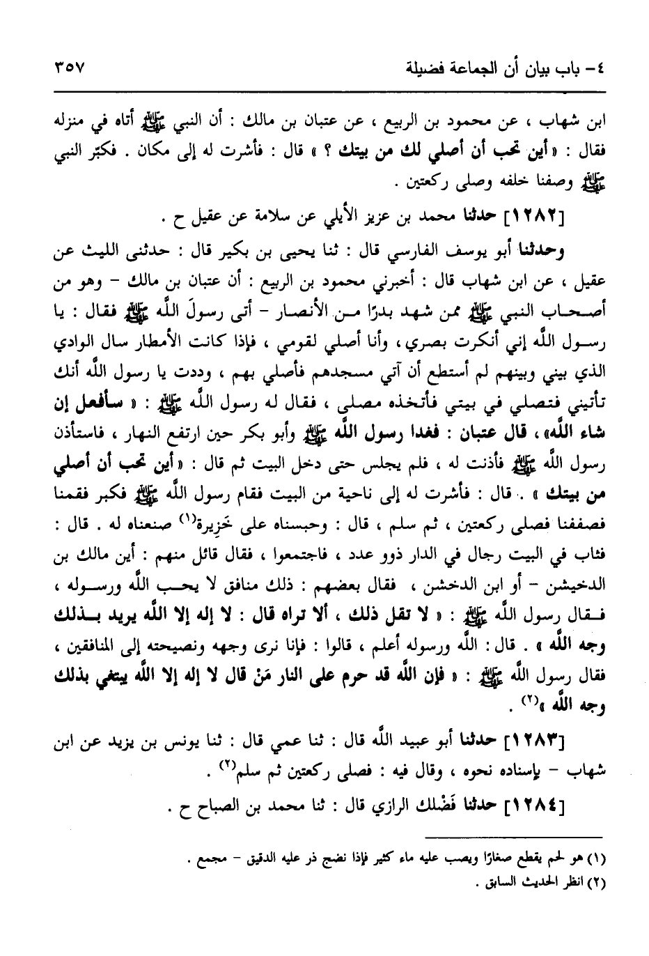 1282 - حَدَّثَنَا مُحَمَّدُ بْنُ عَزِيزٍ الْأَيْلِيُّ، عَنْ سَلَامَةَ، عَنْ عُقَيْلٍ، ح. وَحَدَّثَنَا أَبُو يُوسُفَ الْفَارِسِيُّ قَالَ: ثَنَا يَحْيَى بْنُ بُكَيْرٍ قَالَ: حَدَّثَنِي اللَّيْثُ، عَنْ عُقَيْلٍ، عَنِ ابْنِ شِهَابٍ قَالَ: أَخْبَرَنِي مَحْمُودُ بْنُ الرَّبِيعِ، أَنَّ عِتْبَانَ بْنَ مَالِكٍ، وَهُوَ مِنْ أَصْحَابِ النَّبِيِّ صَلَّى اللهُ عَلَيْهِ وَسَلَّمَ مِمَّنْ شَهِدَ بَدْرًا مِنَ الْأَنْصَارِ أَتَى رَسُولَ اللَّهِ صَلَّى اللهُ عَلَيْهِ وَسَلَّمَ فَقَالَ: يَا رَسُولَ اللَّهِ إِنِّي أَنْكَرْتُ بَصَرِي وَأَنَا أُصَلِّي لِقَوْمِي، فَإِذَا كَانَتِ الْأَمْطَارُ سَالَ الْوَادِي الَّذِي بَيْنِي وَبَيْنَهُمْ لَمْ أَسْتَطِعْ أَنْ آتِيَ مَسْجِدَهُمْ فَأُصَلِّي بِهِمْ، وَدِدْتُ يَا رَسُولَ اللَّهِ أَنَّكَ تَأْتِينِي فَتُصَلِّي فِي بَيْتِي فَأَتَّخِذُهُ مُصَلًّى، فَقَالَ لَهُ رَسُولُ اللَّهِ صَلَّى اللهُ عَلَيْهِ وَسَلَّمَ: «سَأَفْعَلُ إِنْ شَاءَ اللَّهُ» . قَالَ عِتْبَانُ: فَغَدَا رَسُولُ اللَّهِ صَلَّى اللهُ عَلَيْهِ وَسَلَّمَ وَأَبُو بَكْرٍ حِينَ ارْتَفَعَ النَّهَارُ فَاسْتَأْذَنَ رَسُولُ اللَّهِ صَلَّى اللهُ عَلَيْهِ وَسَلَّمَ فَأَذِنْتُ لَهُ فَلَمْ يَجْلِسْ حَتَّى دَخَلَ الْبَيْتَ، ثُمَّ قَالَ: «أَيْنَ تُحِبُّ أَنْ أُصَلِّيَ مِنْ بَيْتِكَ؟» قَالَ: فَأَشَرْتُ لَهُ إِلَى نَاحِيَةٍ مِنَ الْبَيْتِ، فَقَامَ رَسُولُ اللَّهِ صَلَّى اللهُ عَلَيْهِ وَسَلَّمَ، فَكَبَّرَ فَقُمْنَا فَصَفَفْنَا فَصَلَّى رَكْعَتَيْنِ، ثُمَّ سَلَّمَ، قَالَ: وَحَبَسْنَاهُ عَلَى خَزِيرَةٍ صَنَعْنَاهُ لَهُ. قَالَ: فَثَابَ فِي الْبَيْتِ رِجَالٌ فِي الدَّارِ ذَوُو عَدَدٍ فَاجْتَمَعُوا فَقَالَ قَائِلٌ مِنْهُمْ: أَيْنَ مَالِكُ بْنُ الدُّخَيْشِنِ - أَوِ ابْنُ الدُّخْشُنِ - فَقَالَ بَعْضُهُمْ: ذَلِكَ مُنَافِقٌ لَا يُحِبُّ اللَّهَ وَرَسُولَهُ، فَقَالَ رَسُولُ اللَّهِ صَلَّى اللهُ عَلَيْهِ وَسَلَّمَ: " لَا تَقُلْ ذَلِكَ أَلَا تَرَاهُ قَالَ: لَا إِلَهَ إِلَّا اللَّهُ يُرِيدُ بِذَلِكَ وَجْهَ اللَّهِ؟ " قَالَ: اللَّهُ وَرَسُولُهُ أَعْلَمُ، قَالُوا: فَإِنَّا نَرَى وَجْهَهُ وَنَصِيحَتَهُ إِلَى الْمُنَافِقِينَ، فَقَالَ رَسُولُ اللَّهِ صَلَّى اللهُ عَلَيْهِ وَسَلَّمَ: " §فَإِنَّ اللَّهَ قَدْ حَرَّمَ عَلَى النَّارِ مَنْ قَالَ: لَا إِلَهَ إِلَّا اللَّهُ يَبْتَغِي بِذَلِكَ وَجْهَ اللَّهِ "