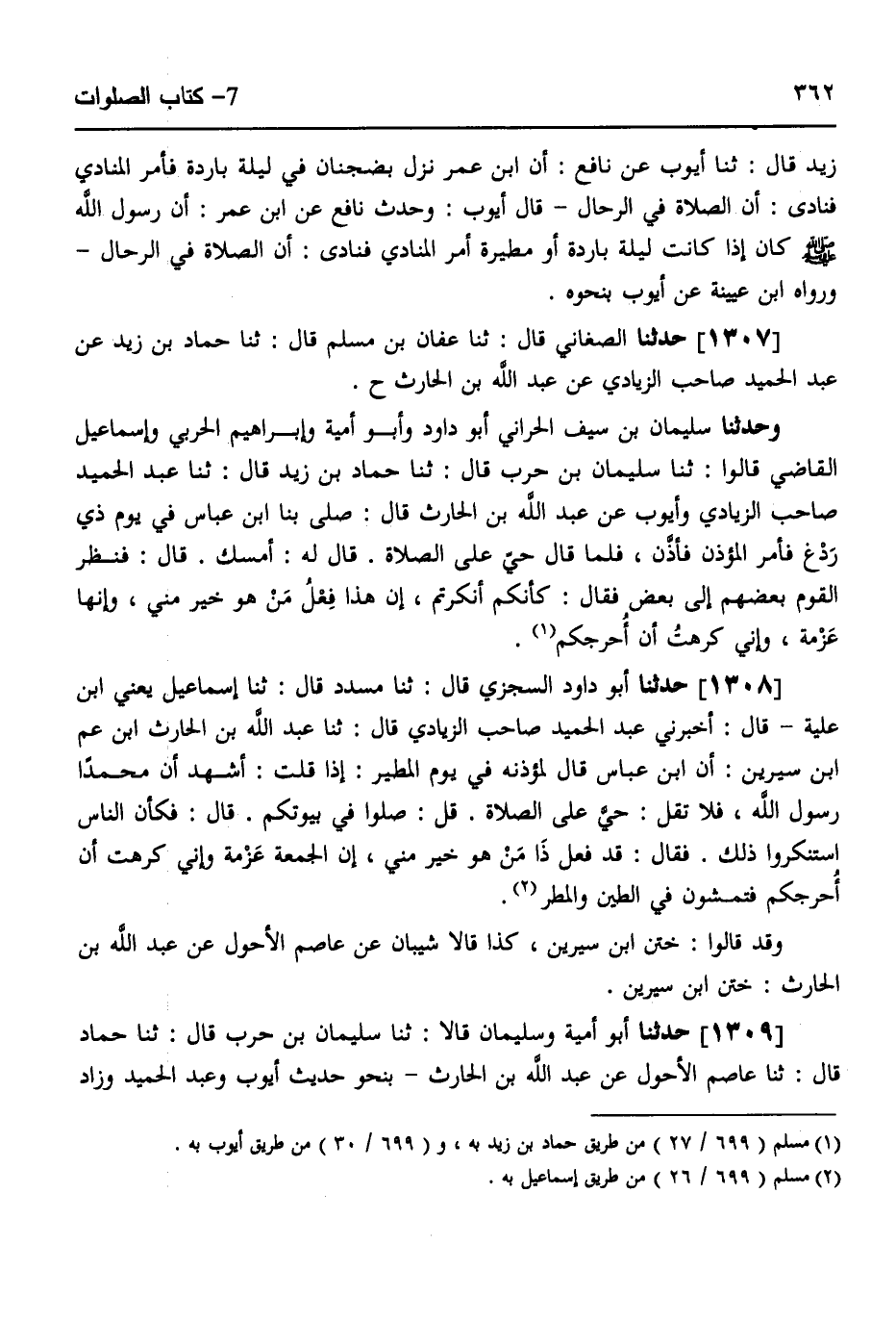 1307 - حَدَّثَنَا الصَّغَانِيُّ قَالَ: ثَنَا عَفَّانُ بْنُ مُسْلِمٍ قَالَ: ثَنَا حَمَّادُ بْنُ زَيْدٍ، عَنْ عَبْدِ الْحَمِيدِ صَاحِبِ الزِّيَادِيِّ، عَنْ عَبْدِ اللَّهِ بْنِ الْحَارِثِ، ح. وَحَدَّثَنَا سُلَيْمَانُ بْنُ سَيْفٍ الْحَرَّانِيُّ، وَأَبُو دَاوُدَ، وَأَبُو أُمَيَّةَ، وَإِبْرَاهِيمُ الْحَرْبِيُّ، وَإِسْمَاعِيلُ الْقَاضِي قَالُوا: ثَنَا سُلَيْمَانُ بْنُ حَرْبٍ قَالَ: ثَنَا حَمَّادُ بْنُ زَيْدٍ قَالَ: ثَنَا عَبْدُ الْحَمِيدِ صَاحِبُ الزِّيَادِيِّ وَأَيُّوبُ، عَنْ عَبْدِ اللَّهِ بْنِ الْحَارِثِ قَالَ: صَلَّى بِنَا ابْنُ عَبَّاسٍ " §فِي يَوْمٍ ذِي رَدْغٍ، فَأَمَرَ الْمُؤَذِّنَ فَأَذَّنَ فَلَمَّا قَالَ: حَيَّ عَلَى الصَّلَاةِ، قَالَ لَهُ أَمْسِكْ، قَالَ: فَنَظَرَ الْقَوْمُ بَعْضُهُمْ إِلَى بَعْضٍ فَقَالَ: كَأَنَّكُمْ أَنْكَرْتُمْ إِنَّ هَذَا فِعْلُ مَنْ هُوَ خَيْرٌ مِنِّي، وَإِنَّهَا عَزْمَةٌ وَإِنِّي كَرِهْتُ أَنْ أُحْرِجَكُمْ "