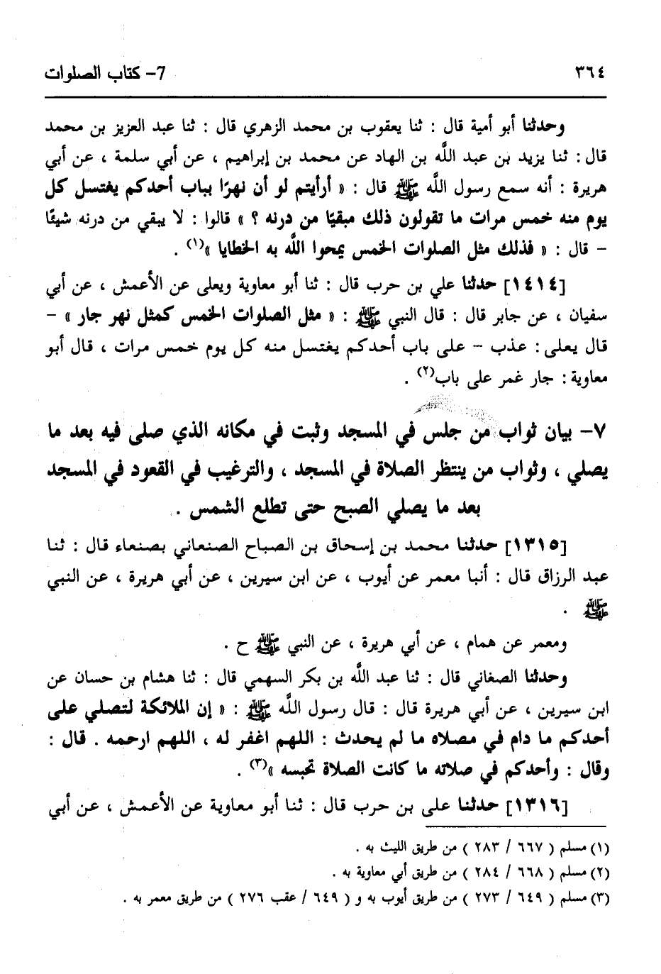 1314 - حَدَّثَنَا عَلِيُّ بْنُ حَرْبٍ قَالَ: ثَنَا أَبُو مُعَاوِيَةَ، وَيَعْلَى، عَنِ الْأَعْمَشِ، عَنْ أَبِي سُفْيَانَ، عَنْ جَابِرٍ قَالَ: قَالَ النَّبِيُّ صَلَّى اللهُ عَلَيْهِ وَسَلَّمَ: «§مَثَلُ الصَّلَوَاتِ الْخَمْسِ كَمَثَلِ نَهَرٍ جَارٍ» قَالَ يَعْلَى: عَذْبٍ عَلَى بَابِ أَحَدِكُمْ يَغْتَسِلُ مِنْهُ كُلَّ يَوْمٍ خَمْسَ مَرَّاتٍ، قَالَ أَبُو مُعَاوِيَةَ: جَارٍ غَمَرٍ عَلَى بَابِ