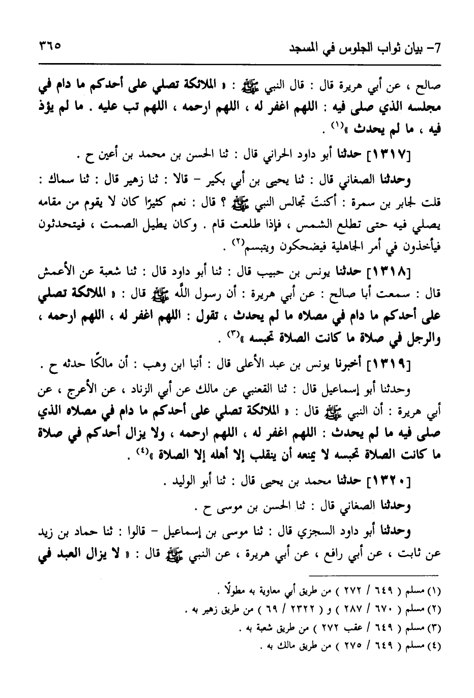 1319 - أَخْبَرَنَا يُونُسُ بْنُ عَبْدِ الْأَعْلَى قَالَ: أنبا ابْنُ وَهْبٍ، أَنَّ مَالِكًا، حَدَّثَهُ ح، وَحَدَّثَنَا أَبُو إِسْمَاعِيلَ قَالَ: ثَنَا الْقَعْنَبِيُّ، عَنْ مَالِكٍ، عَنْ أَبِي الزِّنَادِ، عَنِ الْأَعْرَجِ، عَنْ أَبِي هُرَيْرَةَ، أَنَّ النَّبِيَّ صَلَّى اللهُ عَلَيْهِ وَسَلَّمَ قَالَ: " §الْمَلَائِكَةُ تُصَلِّي عَلَى أَحَدِكُمْ مَا دَامَ فِي مُصَلَّاهُ الَّذِي صَلَّى فِيهِ مَا لَمْ يُحْدِثْ: اللَّهُمَّ اغْفِرْ لَهُ، اللَّهُمَّ ارْحَمْهُ، وَلَا يَزَالُ أَحَدُكُمْ فِي صَلَاةٍ مَا كَانَتِ الصَّلَاةُ تَحْبِسُهُ لَا يَمْنَعُهُ أَنْ يَنْقَلِبِ إِلَى أَهْلِهِ إِلَّا الصَّلَاةُ "