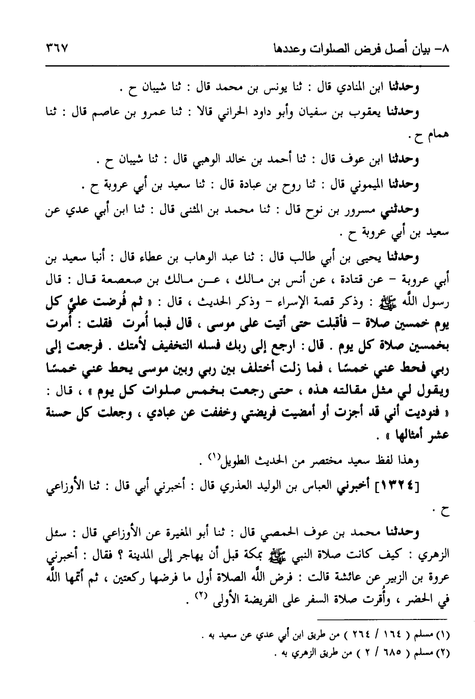 1324 - أَخْبَرَنِي الْعَبَّاسُ بْنُ الْوَلِيدِ الْعُذْرِيُّ قَالَ: أَخْبَرَنِي أَبِي قَالَ: ثَنَا الْأَوْزَاعِيُّ، ح. وَحَدَّثَنَا مُحَمَّدُ بْنُ عَوْفٍ الْحِمْصِيُّ قَالَ: ثَنَا أَبُو الْمُغِيرَةِ، عَنِ الْأَوْزَاعِيِّ قَالَ: سُئِلَ الزُّهْرِيُّ كَيْفَ كَانَتْ صَلَاةُ النَّبِيِّ صَلَّى اللهُ عَلَيْهِ وَسَلَّمَ بِمَكَّةَ قَبْلَ أَنْ يُهَاجِرَ إِلَى الْمَدِينَةِ؟ فَقَالَ: أَخْبَرَنِي عُرْوَةُ بْنُ الزُّبَيْرِ، عَنْ عَائِشَةَ قَالَتْ: «§فَرَضَ اللَّهُ الصَّلَاةَ أَوَّلَ مَا فَرَضَهَا رَكْعَتَيْنِ، ثُمَّ أَتَمَّهَا اللَّهُ فِي الْحَضَرِ، وَأُقِرَّتْ صَلَاةُ السَّفَرِ عَلَى الْفَرِيضَةِ الْأُولَى»