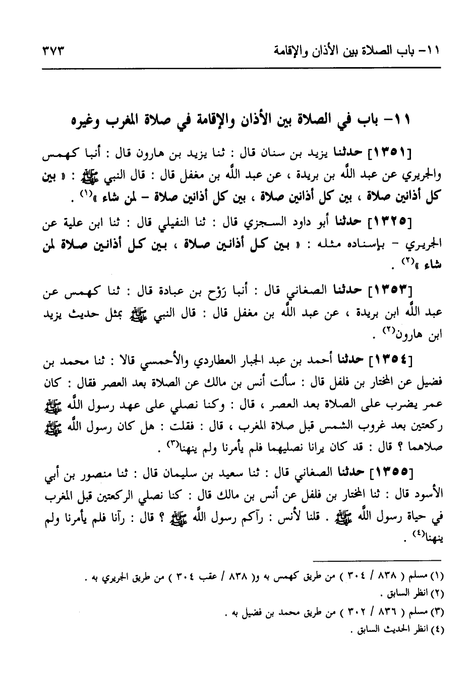 1355 - حَدَّثَنَا الصَّغَانِيُّ قَالَ: ثَنَا سَعِيدُ بْنُ سُلَيْمَانَ قَالَ: ثَنَا مَنْصُورُ بْنُ أَبِي الْأَسْوَدِ قَالَ: ثَنَا الْمُخْتَارُ بْنُ فُلْفُلٍ، عَنْ أَنَسِ بْنِ مَالِكٍ قَالَ: " كُنَّا §نُصَلِّي الرَّكْعَتَيْنِ قَبْلَ الْمَغْرِبِ فِي حَيَاةِ رَسُولِ اللَّهِ صَلَّى اللهُ عَلَيْهِ وَسَلَّمَ، قُلْنَا لِأَنَسٍ: رَآكُمْ رَسُولُ اللَّهِ صَلَّى اللهُ عَلَيْهِ وَسَلَّمَ؟ قَالَ: رَآنَا فَلَمْ يَأْمُرْنَا وَلَمْ -[374]- يَنْهَنَا "