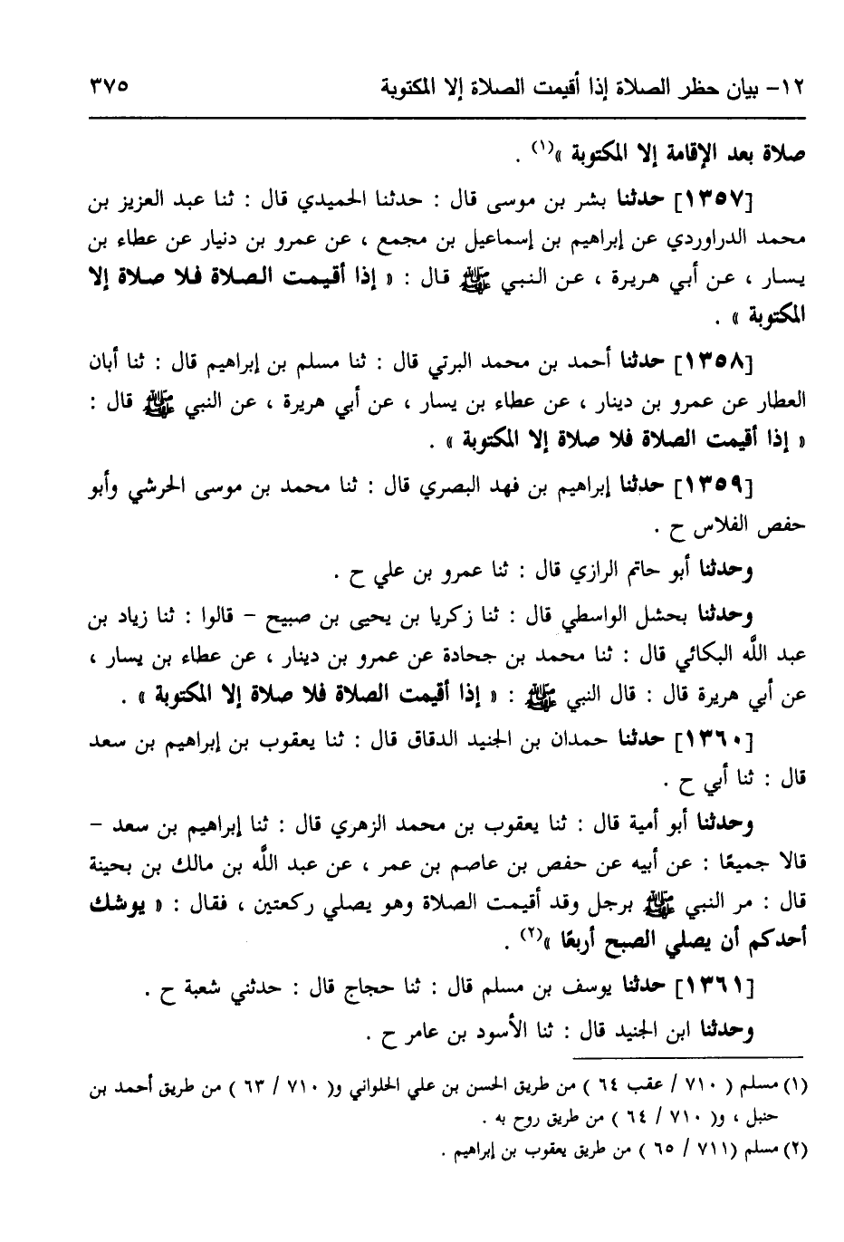 1359 - حَدَّثَنَا إِبْرَاهِيمُ بْنُ فَهْدٍ الْبَصْرِيُّ قَالَ: ثَنَا مُحَمَّدُ بْنُ مُوسَى الْحَرَشِيُّ، وَأَبُو حَفْصٍ الْفَلَّاسُ، ح. وَحَدَّثَنَا أَبُو حَاتِمٍ الرَّازِيُّ قَالَ: ثَنَا عَمْرُو بْنُ عَلِيٍّ، ح. وَحَدَّثَنَا بَحْشَلٌ الْوَاسِطِيُّ قَالَ: ثَنَا زَكَرِيَّا بْنُ يَحْيَى بْنِ صُبَيْحٍ قَالُوا: ثَنَا زِيَادُ بْنُ عَبْدِ اللَّهِ الْبَكَّائِيُّ قَالَ: ثَنَا مُحَمَّدُ بْنُ جُحَادَةَ، عَنْ عَمْرِو بْنِ دِينَارٍ، عَنْ عَطَاءِ بْنِ يَسَارٍ، عَنْ أَبِي هُرَيْرَةَ قَالَ: قَالَ النَّبِيُّ صَلَّى اللهُ عَلَيْهِ وَسَلَّمَ: «§إِذَا أُقِيمَتِ الصَّلَاةُ فَلَا صَلَاةَ إِلَّا الْمَكْتُوبَةَ»