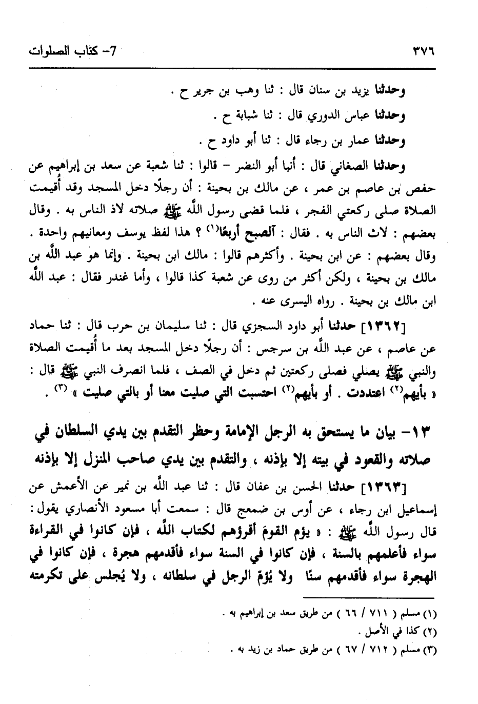1363 - حَدَّثَنَا الْحَسَنُ بْنُ عَفَّانَ قَالَ: ثَنَا عَبْدُ اللَّهِ بْنُ نُمَيْرٍ، عَنِ الْأَعْمَشِ، عَنْ إِسْمَاعِيلَ بْنِ رَجَاءٍ، عَنْ أَوْسِ بْنِ ضَمْعَجٍ قَالَ: سَمِعْتُ أَبَا مَسْعُودٍ الْأَنْصَارِيَّ يَقُولُ: قَالَ رَسُولُ اللَّهِ صَلَّى اللهُ عَلَيْهِ وَسَلَّمَ: «§يَؤُمُّ الْقَوْمَ أَقْرَؤُهُمْ لِكِتَابِ اللَّهِ، فَإِنْ كَانُوا فِي الْقِرَاءَةِ سَوَاءً فَأَعْلَمُهُمْ بِالسُّنَّةِ، فَإِنْ كَانُوا فِي السُّنَّةِ سَوَاءً فَأَقْدَمُهُمْ هِجْرَةً، فَإِنْ كَانُوا فِي الْهِجْرَةِ سَوَاءً فَأَقْدَمُهُمْ سِنًّا، وَلَا يَؤُمَّ الرَّجُلَ فِي سُلْطَانِهِ وَلَا يَجْلِسْ عَلَى تَكْرِمَتِهِ -[377]- فِي بَيْتِهِ إِلَّا بِإِذْنِهِ»