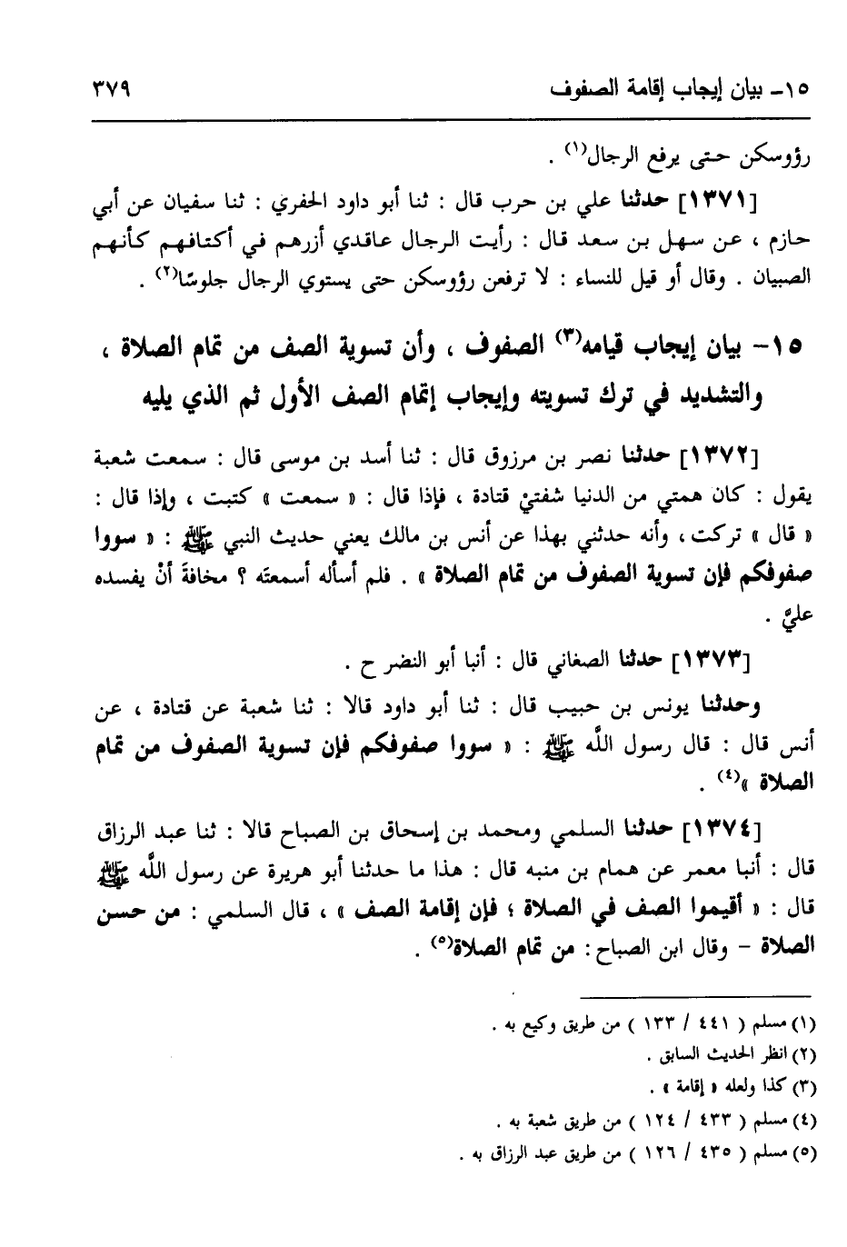 1373 - حَدَّثَنَا الصَّغَانِيُّ قَالَ: أنبا أَبُو النَّضْرِ، ح. وَحَدَّثَنَا يُونُسُ بْنُ حَبِيبٍ قَالَ: ثَنَا أَبُو دَاوُدَ قَالَا: ثَنَا شُعْبَةُ، عَنْ قَتَادَةَ، عَنْ أَنَسٍ قَالَ: قَالَ رَسُولُ اللَّهِ صَلَّى اللهُ عَلَيْهِ وَسَلَّمَ: «§سَوُّوا صُفُوفَكُمْ؛ فَإِنَّ تَسْوِيَةَ الصُّفُوفِ مِنْ تَمَامِ الصَّلَاةِ»