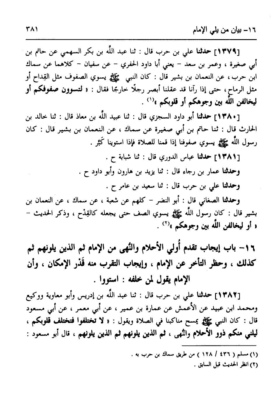 1381 - حَدَّثَنَا عَبَّاسٌ الدُّورِيُّ قَالَ: ثَنَا شَبَابَةُ، ح. وَحَدَّثَنَا عَمَّارُ بْنُ رَجَاءٍ قَالَ: ثَنَا يَزِيدُ بْنُ هَارُونَ، وَأَبُو دَاوُدَ، ح. وَحَدَّثَنَا عَلِيُّ بْنُ حَرْبٍ قَالَ: ثَنَا سَعِيدُ بْنُ عَامِرٍ، ح. وَحَدَّثَنَا الصَّغَانِيُّ، قَالَ أَبُو النَّضْرِ: كُلُّهُمْ، عَنْ شُعْبَةَ، عَنْ سِمَاكٍ، عَنِ النُّعْمَانِ بْنِ بَشِيرٍ قَالَ: «كَانَ رَسُولُ اللَّهِ صَلَّى اللهُ عَلَيْهِ وَسَلَّمَ §يُسَوِّي الصَّفَّ حَتَّى يَجْعَلَهُ كَالْقِدْحِ» وَذَكَرَ الْحَدِيثَ: «أَوْ لَيُخَالِفَنَّ اللَّهُ بَيْنَ وُجُوهِكُمْ»