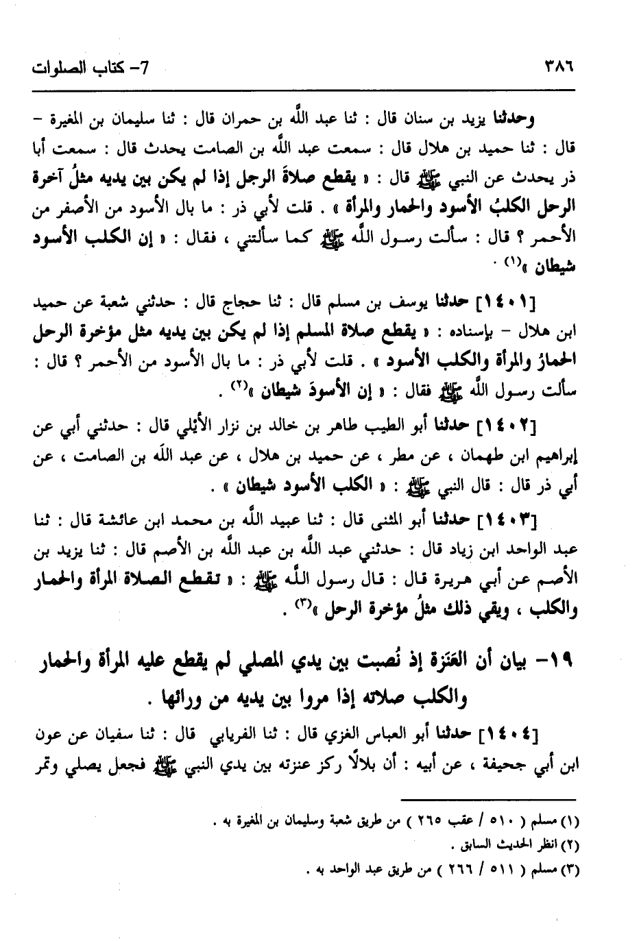 1401 - حَدَّثَنَا يُوسُفُ بْنُ مُسْلِمٍ قَالَ: ثَنَا حَجَّاجٌ قَالَ: حَدَّثَنِي شُعْبَةُ، عَنْ حُمَيْدِ بْنِ هِلَالٍ، بِإِسْنَادِهِ: يَقْطَعُ صَلَاةَ الْمُسْلِمِ إِذَا لَمْ يَكُنْ بَيْنَ يَدَيْهِ مِثْلَ مُؤْخِرَةِ الرَّحْلِ الْحِمَارُ وَالْمَرْأَةُ وَالْكَلْبُ الْأَسْوَدُ، قُلْتُ لِأَبِي ذَرٍّ: مَا بَالُ الْأَسْوَدِ مِنَ الْأَحْمَرِ؟ قَالَ: سَأَلْتُ رَسُولَ اللَّهِ صَلَّى اللهُ عَلَيْهِ وَسَلَّمَ، فَقَالَ: «§إِنَّ الْأَسْوَدَ شَيْطَانٌ»