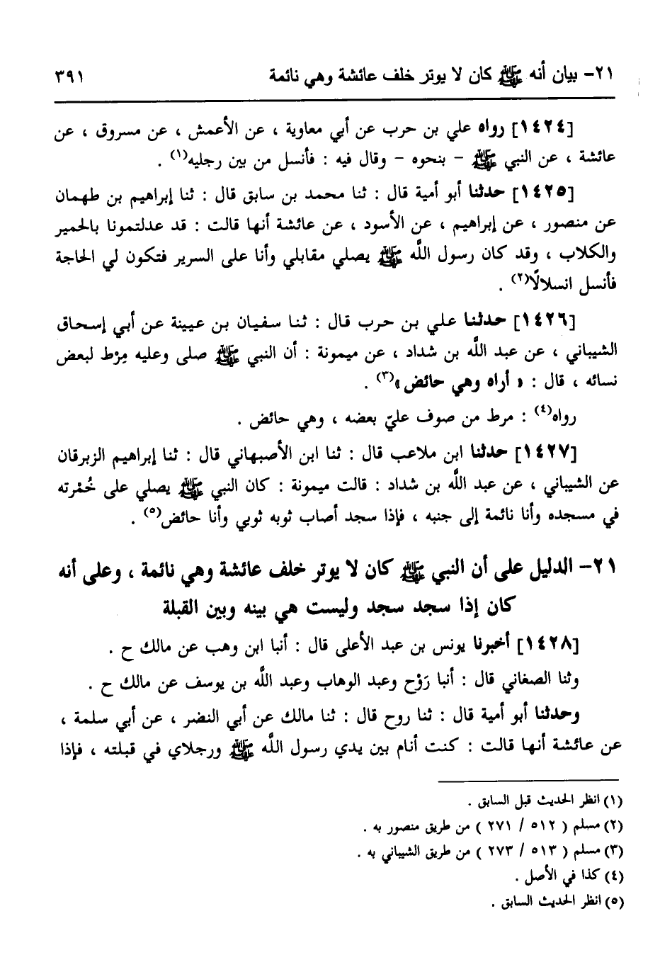1426 - حَدَّثَنَا عَلِيُّ بْنُ حَرْبٍ قَالَ: ثَنَا سُفْيَانُ بْنُ عُيَيْنَةَ، عَنْ أَبِي إِسْحَاقَ الشَّيْبَانِيِّ، عَنْ عَبْدِ اللَّهِ بْنِ شَدَّادٍ، عَنْ مَيْمُونَةَ، أَنَّ النَّبِيَّ صَلَّى اللهُ عَلَيْهِ وَسَلَّمَ " §صَلَّى وَعَلَيْهِ مِرْطٌ لِبَعْضِ نِسَائِهِ قَالَ: أُرَاهُ وَهِيَ حَائِضٌ " رَوَاهُ: مِرْطٌ مِنْ صُوفٍ عَلَيَّ بَعْضُهُ وَهِيَ حَائِضٌ