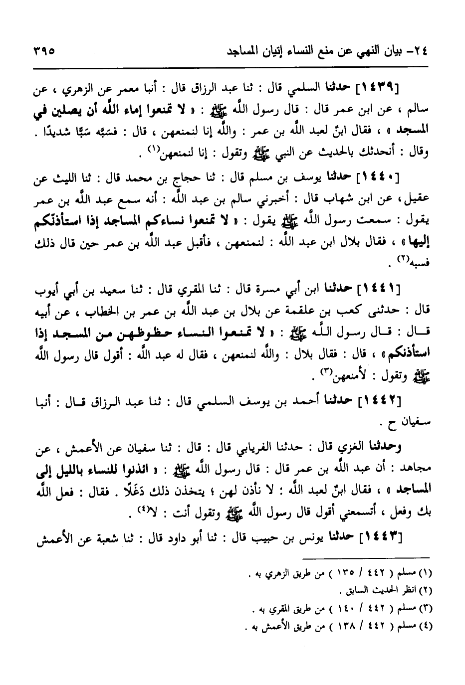1439 - حَدَّثَنَا السُّلَمِيُّ قَالَ: ثَنَا عَبْدُ الرَّزَّاقِ قَالَ: أنبا مَعْمَرٌ، عَنِ الزُّهْرِيِّ، عَنْ سَالِمٍ، عَنِ ابْنِ عُمَرَ قَالَ: قَالَ رَسُولُ اللَّهِ صَلَّى اللهُ عَلَيْهِ وَسَلَّمَ: «§لَا تَمْنَعُوا إِمَاءَ اللَّهِ أَنْ يُصَلِّينَ فِي الْمَسْجِدِ» فَقَالَ ابْنٌ لِعَبْدِ اللَّهِ بْنِ عُمَرَ: وَاللَّهِ إِنَّا لَنَمْنَعُهُنَّ، قَالَ: فَسَبَّهُ سَبًّا شَدِيدًا وَقَالَ: أَنُحَدِّثُكَ بِالْحَدِيثِ عَنِ النَّبِيِّ صَلَّى اللهُ عَلَيْهِ وَسَلَّمَ وَتَقُولُ إِنَّا لَنَمْنَعُهُنَّ