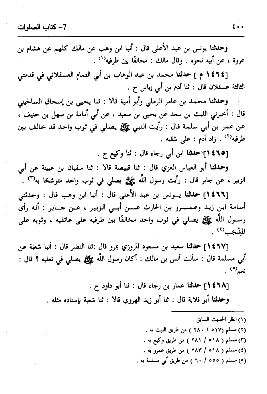 1467 - حَدَّثَنَا سَعِيدُ بْنُ مَسْعُودٍ الْمَرْوَزِيُّ بِمَرْوَ قَالَ: ثَنَا النَّضْرُ قَالَ: أنبا شُعْبَةُ، عَنْ أَبِي مَسْلَمَةَ قَالَ: سَأَلْتُ أَنَسَ بْنَ مَالِكٍ " §أَكَانَ رَسُولُ اللَّهِ صَلَّى اللهُ عَلَيْهِ وَسَلَّمَ يُصَلِّي فِي نَعْلَيْهِ؟ قَالَ: نَعَمْ "