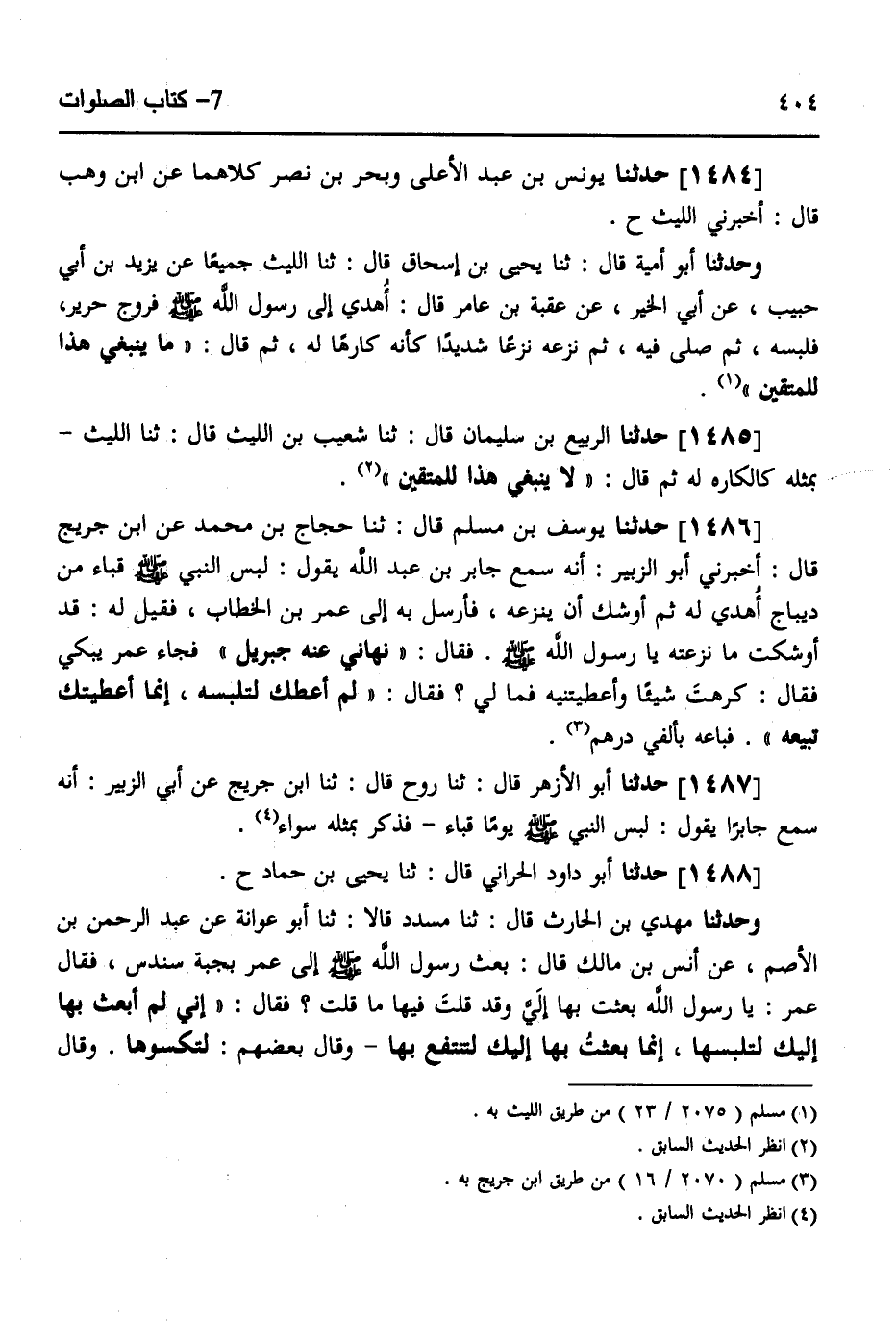 1484 - حَدَّثَنَا يُونُسُ بْنُ عَبْدِ الْأَعْلَى، وَبَحْرُ بْنُ نَصْرٍ كِلَاهُمَا، عَنِ ابْنِ وَهْبٍ قَالَ: أَخْبَرَنِي اللَّيْثُ، ح. وَحَدَّثَنَا أَبُو أُمَيَّةَ قَالَ: ثَنَا يَحْيَى بْنُ إِسْحَاقَ قَالَ: ثَنَا اللَّيْثُ جَمِيعًا، عَنْ يَزِيدَ بْنِ أَبِي حَبِيبٍ، عَنْ أَبِي الْخَيْرِ، عَنْ عُقْبَةَ بْنِ عَامِرٍ قَالَ: أُهْدِيَ إِلَى رَسُولِ اللَّهِ صَلَّى اللهُ عَلَيْهِ وَسَلَّمَ فَرُّوجُ حَرِيرٍ فَلَبِسَهُ، ثُمَّ صَلَّى فِيهِ، ثُمَّ نَزَعَهُ نَزْعًا شَدِيدًا كَأَنَّهُ كَارِهًا لَهُ، ثُمَّ قَالَ: «§مَا يَنْبَغِي هَذَا لِلْمُتَّقِينَ»