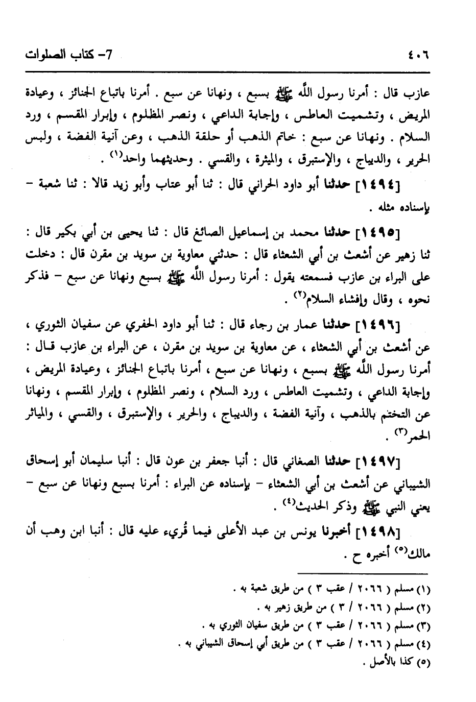 1496 - حَدَّثَنَا عَمَّارُ بْنُ رَجَاءٍ قَالَ: ثَنَا أَبُو دَاوُدَ الْحَفَرِيُّ، عَنْ سُفْيَانَ الثَّوْرِيِّ، عَنْ أَشْعَثَ بْنِ أَبِي الشَّعْثَاءِ، عَنْ مُعَاوِيَةَ بْنِ سُوَيْدِ بْنِ مُقَرِّنٍ، عَنِ الْبَرَاءِ بْنِ عَازِبٍ قَالَ: " §أَمَرَنَا رَسُولُ اللَّهِ صَلَّى اللهُ عَلَيْهِ وَسَلَّمَ بِسَبْعٍ وَنَهَانَا عَنْ سَبْعٍ: أَمَرَنَا بِاتِّبَاعِ الْجَنَائِزِ، وَعِيَادَةِ الْمَرِيضِ، وَإِجَابَةِ الدَّاعِي، وَتَشْمِيتِ الْعَاطِسِ، وَرَدِّ السَّلَامِ، وَنَصْرِ الْمَظْلُومِ، وَإِبْرَارِ الْمُقْسِمِ، وَنَهَانَا عَنِ: التَّخَتُّمِ بِالذَّهَبِ، وَآنِيَةِ الْفِضَّةِ، وَالدِّيبَاجِ، وَالْحَرِيرِ، وَالْإِسْتَبْرَقِ، وَالْقَسِّيِّ، وَالْمَيَاثِرِ الْحُمُرِ "