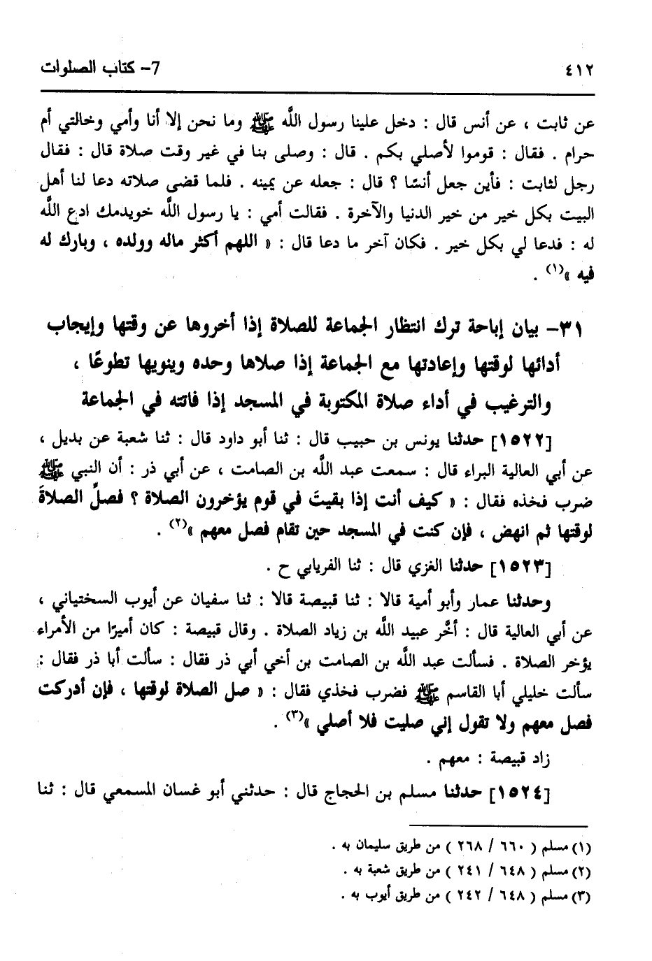 1524 - حَدَّثَنَا مُسْلِمُ بْنُ الْحَجَّاجِ قَالَ: حَدَّثَنِي أَبُو غَسَّانَ الْمِسْمَعِيُّ قَالَ: ثَنَا -[413]- مُعَاذٌ قَالَ: حَدَّثَنِي أَبِي، عَنْ مَطَرٍ، عَنْ أَبِي الْعَالِيَةِ الْبَرَاءِ قَالَ: قُلْتُ لِعَبْدِ اللَّهِ بْنِ الصَّامِتِ: نُصَلِّي يَوْمَ الْجُمُعَةِ خَلْفَ أُمَرَاءَ فَيُؤَخِّرُونَ الصَّلَاةَ، قَالَ: فَضَرَبَ فَخِذِي ضَرْبًا - أَوْ ضَرْبَةً - أَوْجَعَنِي، وَقَالَ: سَأَلْتُ أَبَا ذَرٍّ عَنْ ذَلِكَ فَضَرَبَ فَخِذِي، فَقَالَ: سَأَلْتُ رَسُولَ اللَّهِ صَلَّى اللهُ عَلَيْهِ وَسَلَّمَ فَقَالَ: «§صَلُّوا الصَّلَاةَ وَاجْعَلُوا صَلَاتَكُمْ مَعَهُمْ نَافِلَةً» قَالَ: وَقَالَ عَبْدُ اللَّهِ: ذُكِرَ لِي أَنَّ نَبِيَّ اللَّهِ صَلَّى اللهُ عَلَيْهِ وَسَلَّمَ ضَرَبَ فَخِذَ أَبِي ذَرٍّ