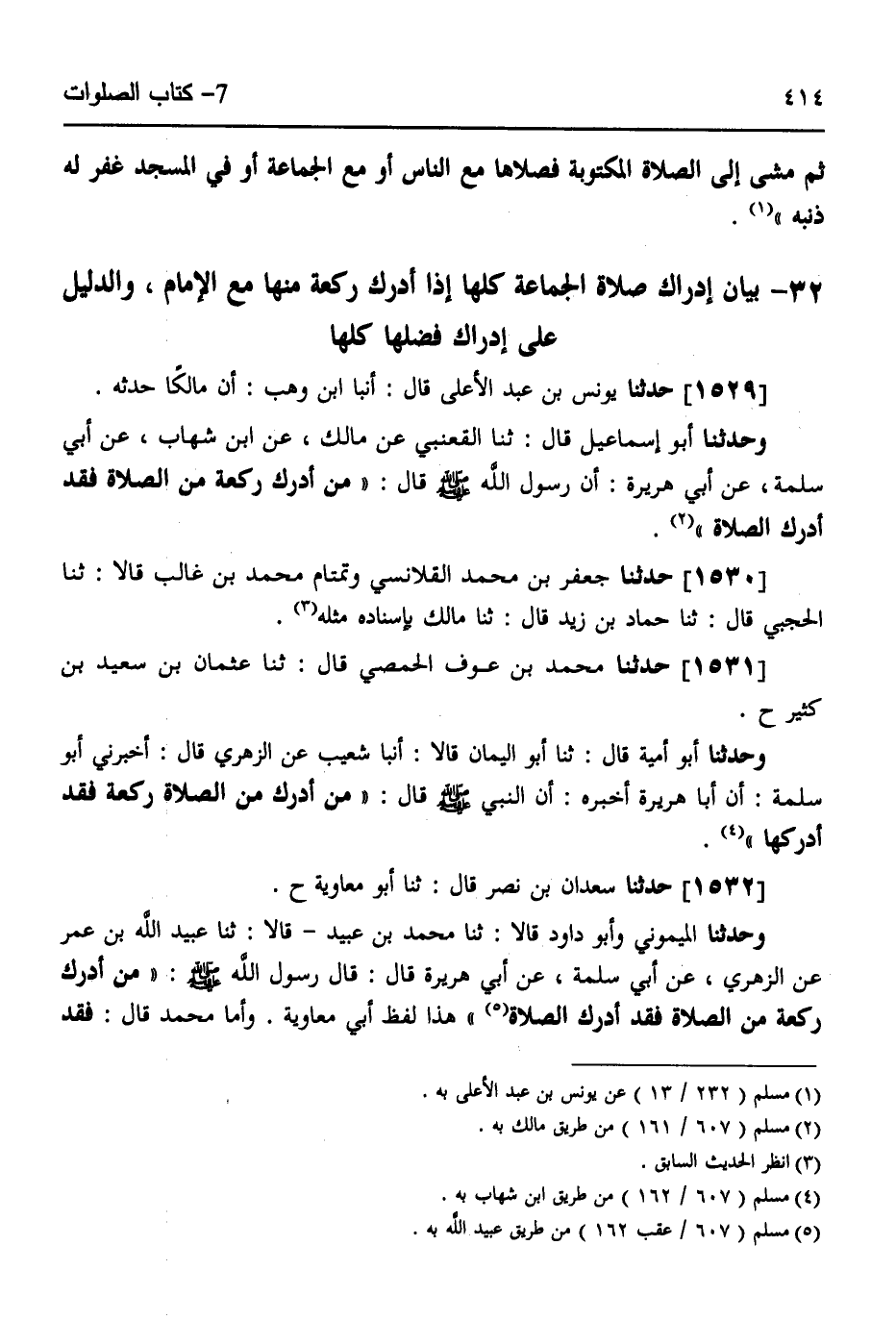 1532 - حَدَّثَنَا سَعْدَانُ بْنُ نَصْرٍ قَالَ: ثَنَا أَبُو مُعَاوِيَةَ، ح. وَحَدَّثَنَا الْمَيْمُونِيُّ، وَأَبُو دَاوُدَ قَالَا: ثَنَا مُحَمَّدُ بْنُ عُبَيْدٍ قَالَا: ثَنَا عُبَيْدُ اللَّهِ بْنُ عُمَرَ، عَنِ الزُّهْرِيِّ، عَنْ أَبِي سَلَمَةَ، عَنْ أَبِي هُرَيْرَةَ قَالَ: قَالَ رَسُولُ اللَّهِ صَلَّى اللهُ عَلَيْهِ وَسَلَّمَ: «§مَنْ أَدْرَكَ رَكْعَةً مِنَ الصَّلَاةِ فَقَدْ أَدْرَكَ الصَّلَاةَ» هَذَا لَفْظُ أَبِي مُعَاوِيَةَ، وَأَمَّا مُحَمَّدً قَالَ: فَقَدْ -[415]- أَدْرَكَهَا كُلَّهَا
