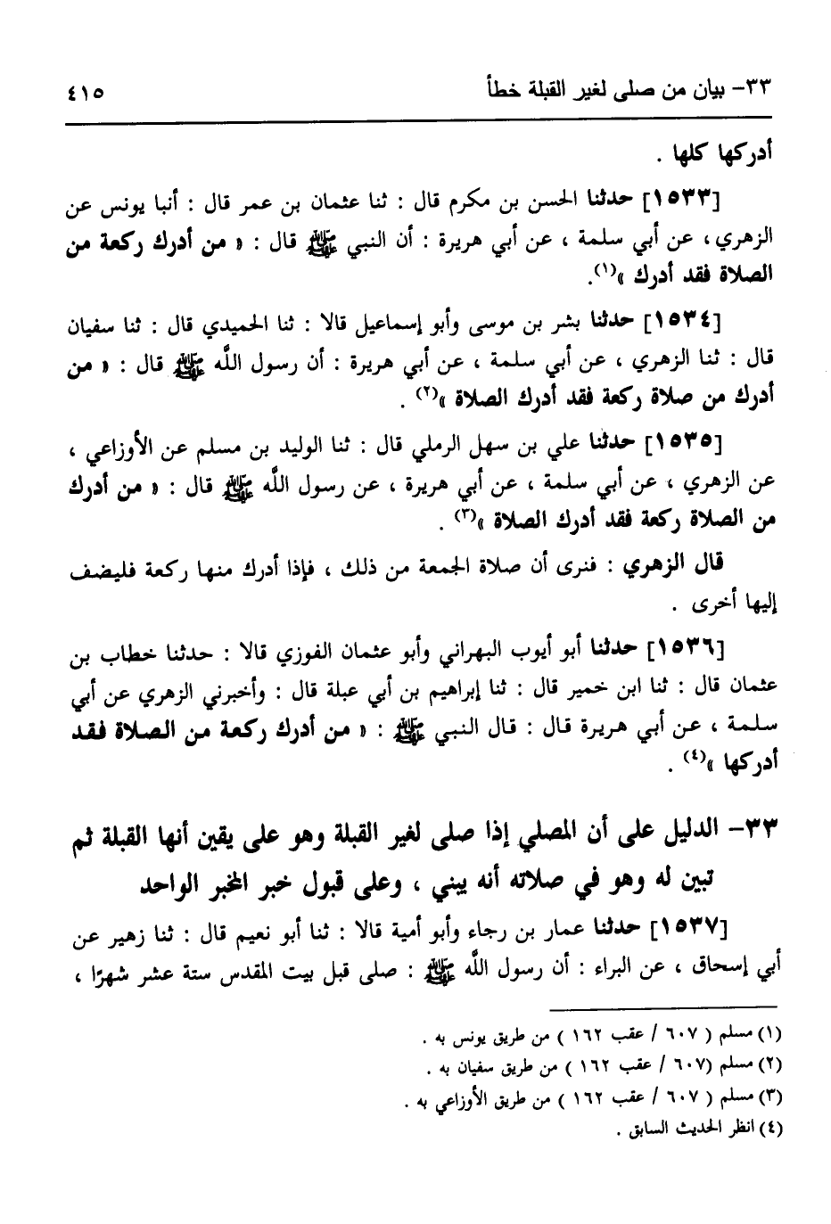 1534 - حَدَّثَنَا بِشْرُ بْنُ مُوسَى، وَأَبُو إِسْمَاعِيلَ قَالَا: ثَنَا الْحُمَيْدِيُّ قَالَ: ثَنَا سُفْيَانُ قَالَ: ثَنَا الزُّهْرِيُّ، عَنْ أَبِي سَلَمَةَ، عَنْ أَبِي هُرَيْرَةَ، أَنَّ رَسُولَ اللَّهِ صَلَّى اللهُ عَلَيْهِ وَسَلَّمَ قَالَ: «§مَنْ أَدْرَكَ مِنْ صَلَاةٍ رَكْعَةً فَقَدْ أَدْرَكَ الصَّلَاةَ»