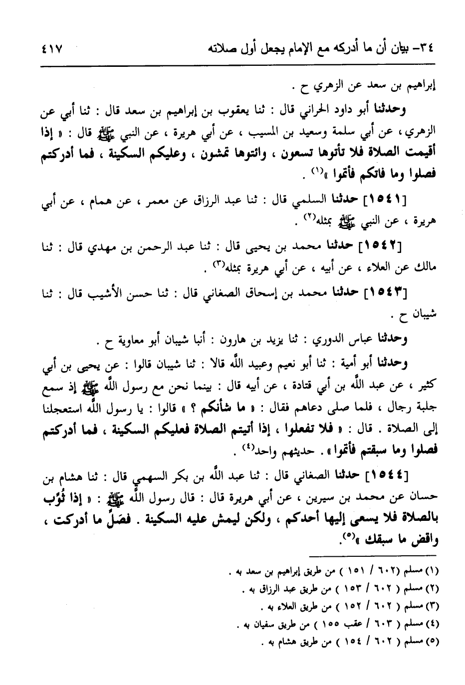 1543 - حَدَّثَنَا مُحَمَّدُ بْنُ إِسْحَاقَ الصَّغَانِيُّ قَالَ: ثَنَا حَسَنٌ الْأَشْيَبُ قَالَ: ثَنَا شَيْبَانُ، ح. وَحَدَّثَنَا عَبَّاسٌ الدُّورِيُّ، ثَنَا يَزِيدُ بْنُ هَارُونَ، أنبا شَيْبَانُ أَبُو مُعَاوِيَةَ، ح. وَحَدَّثَنَا أَبُو أُمَيَّةَ، ثَنَا أَبُو نُعَيْمٍ، وَعُبَيْدُ اللَّهِ قَالَا: ثَنَا شَيْبَانُ قَالُوا: عَنْ يَحْيَى بْنِ أَبِي كَثِيرٍ، عَنْ عَبْدِ اللَّهِ بْنِ أَبِي قَتَادَةَ، عَنْ أَبِيهِ قَالَ: بَيْنَمَا نَحْنُ مَعَ رَسُولِ اللَّهِ صَلَّى اللهُ عَلَيْهِ وَسَلَّمَ إِذْ سَمِعَ جَلَبَةَ رِجَالٍ، فَلَمَّا صَلَّى دَعَاهُمْ فَقَالَ: «§مَا شَأْنُكُمْ؟» قَالُوا: يَا رَسُولَ اللَّهِ اسْتَعْجَلْنَا إِلَى الصَّلَاةِ، قَالَ: «فَلَا تَفْعَلُوا، إِذَا أَتَيْتُمُ الصَّلَاةَ فَعَلَيْكُمُ السَّكِينَةُ، فَمَا أَدْرَكْتُمْ فَصَلُّوا وَمَا سُبِقْتُمْ فَأَتِمُّوا» حَدِيثُهُمْ وَاحِدٌ