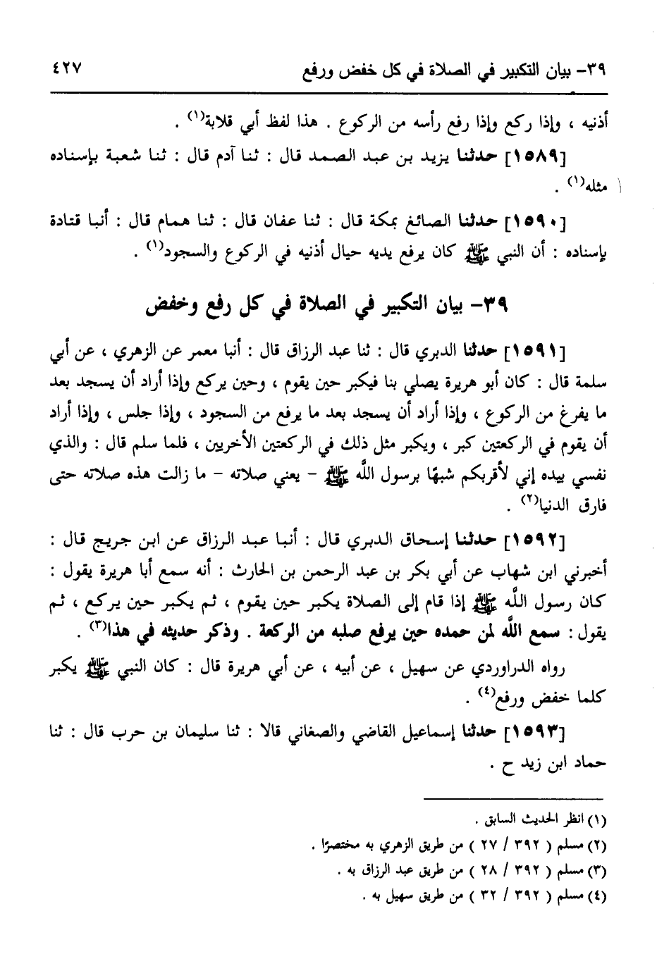 1592 - حَدَّثَنَا إِسْحَاقُ الدَّبَرِيُّ قَالَ: أنبا عَبْدُ الرَّزَّاقِ، عَنِ ابْنِ جُرَيْجٍ، قَالَ: أَخْبَرَنِي ابْنُ شِهَابٍ، عَنْ أَبِي بَكْرِ بْنِ عَبْدِ الرَّحْمَنِ بْنِ الْحَارِثِ، أَنَّهُ سَمِعَ أَبَا هُرَيْرَةَ يَقُولُ: " كَانَ رَسُولُ اللَّهِ صَلَّى اللهُ عَلَيْهِ وَسَلَّمَ §إِذَا قَامَ إِلَى الصَّلَاةِ يُكَبِّرُ حِينَ يَقُومُ، ثُمَّ يُكَبِّرُ حِينَ يَرْكَعُ، ثُمَّ يَقُولُ: «سَمِعَ اللَّهُ لِمَنْ حَمِدَهُ» . حِينَ يَرْفَعُ صُلْبَهُ مِنَ الرَّكْعَةِ " وَذَكَرَ حَدِيثَهُ فِي هَذَا. رَوَاهُ الدَّرَاوَرْدِيُّ، عَنْ سُهَيْلٍ، عَنْ أَبِيهِ، عَنْ أَبِي هُرَيْرَةَ قَالَ: كَانَ النَّبِيُّ صَلَّى اللهُ عَلَيْهِ وَسَلَّمَ يُكَبِّرُ كُلَّمَا خَفَضَ وَرَفَعَ