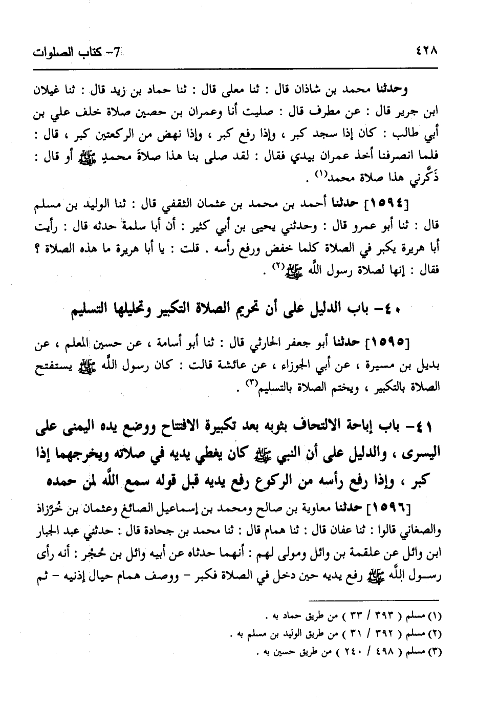 1596 - حَدَّثَنَا مُعَاوِيَةُ بْنُ صَالِحٍ، وَمُحَمَّدُ بْنُ إِسْمَاعِيلَ الصَّائِغُ، وَعُثْمَانُ بْنُ خُرَّزَاذَ، وَالصَّغَانِيُّ قَالُوا: ثَنَا عَفَّانُ قَالَ: ثَنَا هَمَّامٌ قَالَ: ثَنَا مُحَمَّدُ بْنُ جُحَادَةَ قَالَ: حَدَّثَنِي عَبْدُ الْجَبَّارِ بْنُ وَائِلٍ، عَنْ عَلْقَمَةَ بْنِ وَائِلٍ، وَمَوْلًى لَهُمْ أَنَّهُمَا حَدَّثَاهُ، عَنْ أَبِيهِ وَائِلِ بْنِ حُجْرٍ، " أَنَّهُ رَأَى رَسُولَ اللَّهِ صَلَّى اللهُ عَلَيْهِ وَسَلَّمَ §رَفَعَ يَدَيْهِ حِينَ دَخَلَ فِي الصَّلَاةِ فَكَبَّرَ - وَوَصَفَ هَمَّامٌ حِيَالَ أُذُنَيْهِ - ثُمَّ -[429]- الْتَحَفَ بِثَوْبِهِ، ثُمَّ وَضَعَ يَدَهُ الْيُمْنَى عَلَى الْيُسْرَى، فَلَمَّا أَرَادَ أَنْ يَرْكَعَ أَخْرَجَ يَدَيْهِ مِنَ الثَّوْبِ، ثُمَّ رَفَعَهُمَا وَكَبَّرَ فَرَكَعَ، فَلَمَّا قَالَ: «سَمِعَ اللَّهُ لِمَنْ حَمِدَهُ» رَفَعَ يَدَيْهِ، فَلَمَّا سَجَدَ سَجَدَ بَيْنَ كَفَّيْهِ "