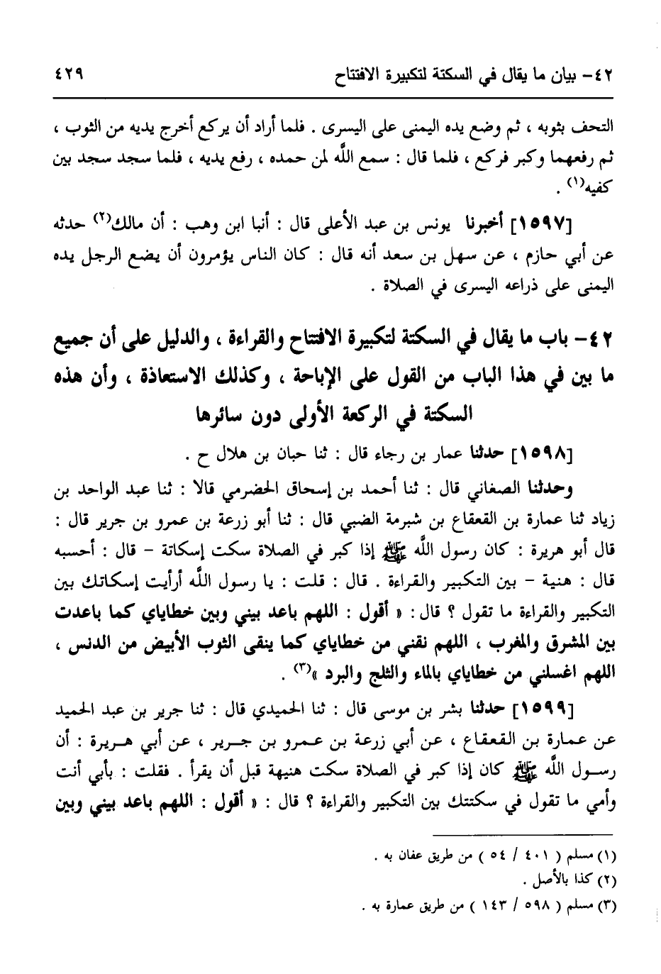 1598 - حَدَّثَنَا عَمَّارُ بْنُ رَجَاءٍ قَالَ: ثَنَا حَبَّانُ بْنُ هِلَالٍ، ح. وَحَدَّثَنَا الصَّغَانِيُّ قَالَ: ثَنَا أَحْمَدُ بْنُ إِسْحَاقَ الْحَضْرَمِيُّ قَالَا: ثَنَا عَبْدُ الْوَاحِدِ بْنُ زِيَادٍ، ثَنَا عُمَارَةُ بْنُ الْقَعْقَاعِ بْنِ شُبْرُمَةَ الضَّبِّيُّ قَالَ: ثَنَا أَبُو زُرْعَةَ بْنِ عَمْرِو بْنِ جَرِيرٍ قَالَ: قَالَ أَبُو هُرَيْرَةَ كَانَ رَسُولُ اللَّهِ صَلَّى اللهُ عَلَيْهِ وَسَلَّمَ إِذَا كَبَّرَ فِي الصَّلَاةِ سَكَتَ إِسْكَاتَةً - قَالَ: أَحْسَبُهُ قَالَ: هُنَيَّةً - بَيْنَ التَّكْبِيرِ وَالْقِرَاءَةِ قَالَ: قُلْتُ: يَا رَسُولَ اللَّهِ أَرَأَيْتَ إِسْكَاتَكَ بَيْنَ التَّكْبِيرِ وَالْقِرَاءَةِ مَا تَقُولُ؟ قَالَ: «§أَقُولُ اللَّهُمَّ بَاعِدْ بَيْنِي وَبَيْنَ خَطَايَايَ كَمَا بَاعَدْتَ بَيْنَ الْمَشْرِقِ وَالْمَغْرِبِ، اللَّهُمَّ نَقِّنِي مِنْ خَطَايَايَ كَمَا يُنَقَّى الثَّوْبُ الْأَبْيَضُ مِنَ الدَّنَسِ، اللَّهُمَّ اغْسِلْنِي مِنْ خَطَايَايَ بِالْمَاءِ وَالثَّلْجِ وَالْبَرَدِ»