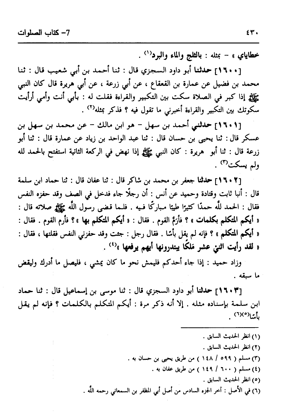 1601 - حَدَّثَنِي أَحْمَدُ بْنُ سَهْلٍ هُوَ ابْنُ مَالِكٍ، عَنْ مُحَمَّدِ بْنِ سَهْلِ بْنِ عَسْكَرَ قَالَ: ثَنَا يَحْيَى بْنُ حَسَّانَ قَالَ: ثَنَا عَبْدُ الْوَاحِدِ بْنُ زِيَادٍ، عَنْ عُمَارَةَ قَالَ: ثَنَا أَبُو زُرْعَةَ قَالَ: ثَنَا أَبُو هُرَيْرَةَ، «كَانَ النَّبِيُّ صَلَّى اللهُ عَلَيْهِ وَسَلَّمَ §إِذَا نَهَضَ فِي الرَّكْعَةِ الثَّانِيَةِ اسْتَفْتَحَ بِالْحَمْدِ لِلَّهِ وَلَمْ يَسْكُتْ»
