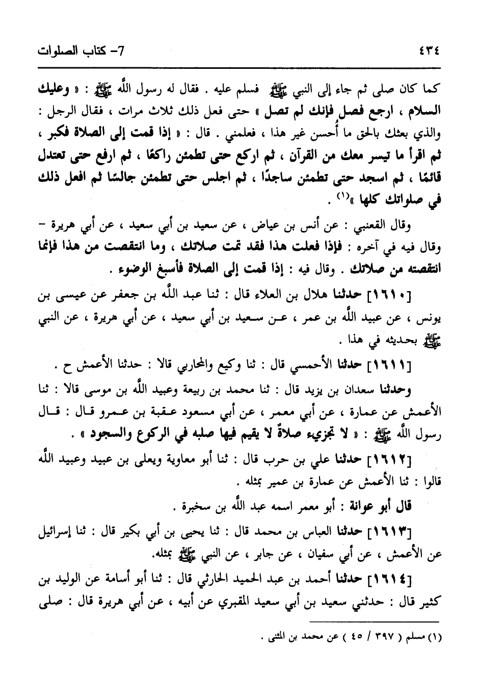 1614 - حَدَّثَنَا أَحْمَدُ بْنُ عَبْدِ الْحَمِيدِ الْحَارِثِيُّ قَالَ: ثَنَا أَبُو أُسَامَةَ، عَنِ الْوَلِيدِ بْنِ كَثِيرٍ قَالَ: حَدَّثَنِي سَعِيدُ بْنُ أَبِي سَعِيدٍ الْمَقْبُرِيُّ، عَنْ أَبِيهِ، عَنْ أَبِي هُرَيْرَةَ قَالَ: صَلَّى -[435]- رَسُولُ اللَّهِ صَلَّى اللهُ عَلَيْهِ وَسَلَّمَ يَوْمًا، ثُمَّ انْصَرَفَ فَقَالَ: «§يَا فُلَانُ أَلَا تُحْسِنُ صَلَاتَكَ، أَلَا يَنْظُرُ الْمُصَلِّي إِذَا صَلَّى كَيْفَ يُصَلِّي، فَإِنَّمَا يُصَلِّي لِنَفْسِهِ، إِنِّي وَاللَّهِ لَأُبْصِرُ مِنْ وَرَائِي كَمَا أُبْصِرُ مِنْ بَيْنِ يَدَيَّ»