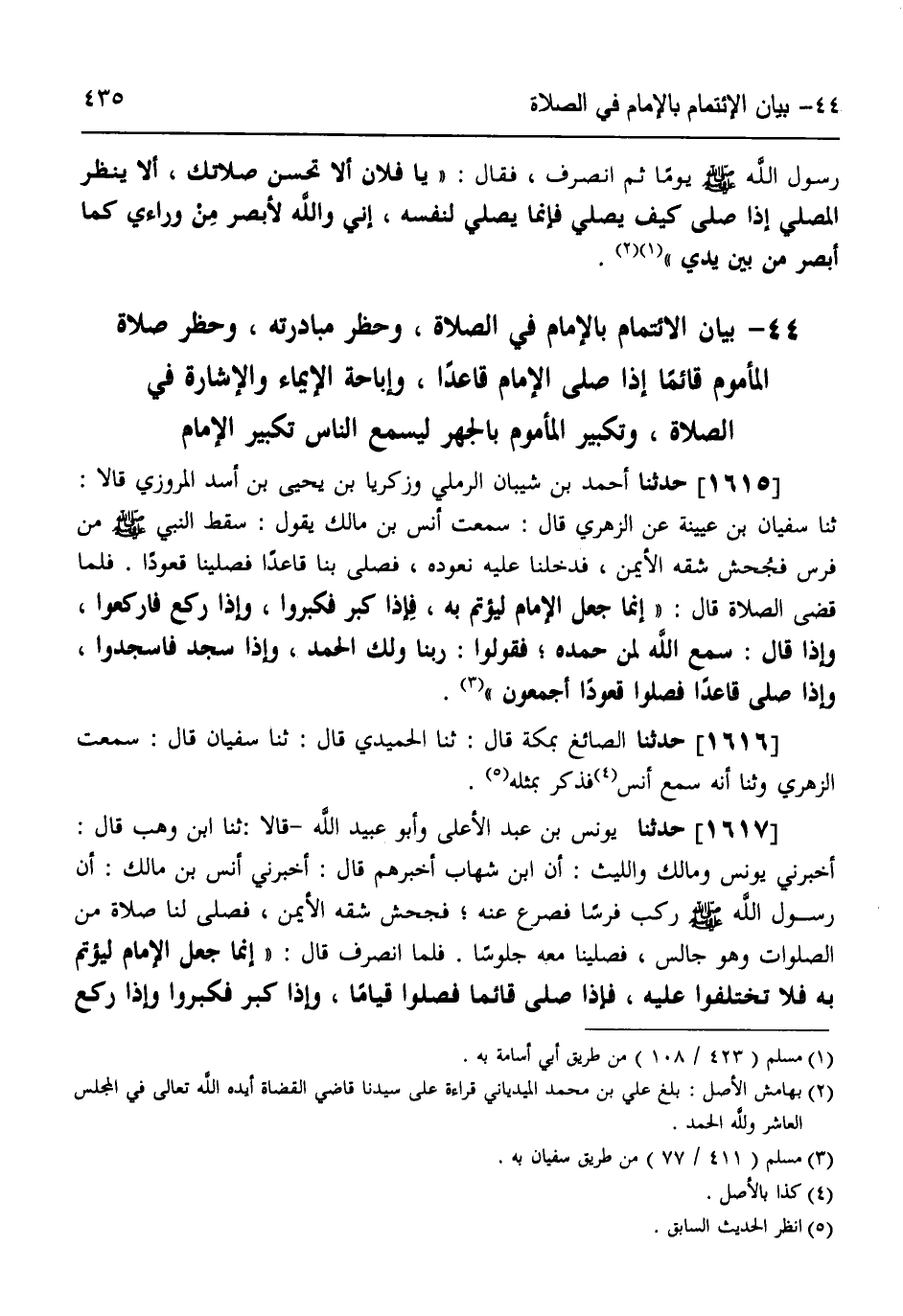 §بَيَانُ الِائْتِمَامِ بِالْإِمَامِ فِي الصَّلَاةِ وَحَظْرِ مُبَادَرَتِهِ وَحَظْرِ صَلَاةِ الْمَأْمُومِ قَائِمًا إِذَا صَلَّى الْإِمَامُ قَاعِدًا، وَإِبَاحَةِ الْإِيمَاءِ وَالإِشَارَةِ فِي الصَّلَاةِ وَتَكْبِيرِ الْمَأْمُومِ بِالْجَهْرِ لَيَسْمَعَ النَّاسُ تَكْبِيرَ الْإِمَامِ