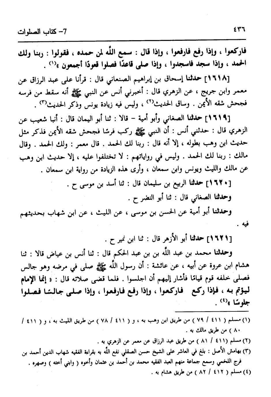 1619 - حَدَّثَنَا الصَّغَانِيُّ، وَأَبُو أُمَيَّةَ قَالَا: ثَنَا أَبُو الْيَمَانِ قَالَ: أنبا شُعَيْبٌ، عَنِ الزُّهْرِيِّ قَالَ: حَدَّثَنِي أَنَسٌ، أَنَّ النَّبِيَّ صَلَّى اللهُ عَلَيْهِ وَسَلَّمَ «§رَكِبَ فَرَسًا فَجُحِشَ شِقُّهُ الْأَيْمَنُ» فَذَكَرَ مِثْلَ حَدِيثِ ابْنِ وَهْبٍ بِطُولِهِ إِلَّا أَنَّهُ قَالَ: رَبَّنَا لَكَ الْحَمْدُ. قَالَ مَعْمَرٌ: وَلَكَ الْحَمْدُ. وَقَالَ مَالِكٌ: رَبَّنَا لَكَ الْحَمْدُ. وَلَيْسَ فِي رِوَايَاتِهِمْ: لَا تَخْتَلِفُوا عَلَيْهِ إِلَّا حَدِيثِ ابْنِ وَهْبٍ، عَنْ مَالِكٍ وَاللَّيْثِ وَيُونُسَ، وَابْنِ سَمْعَانَ، وَأَرَى هَذِهِ الزِّيَادَةَ مِنْ رِوَايَةِ ابْنِ سَمْعَانَ