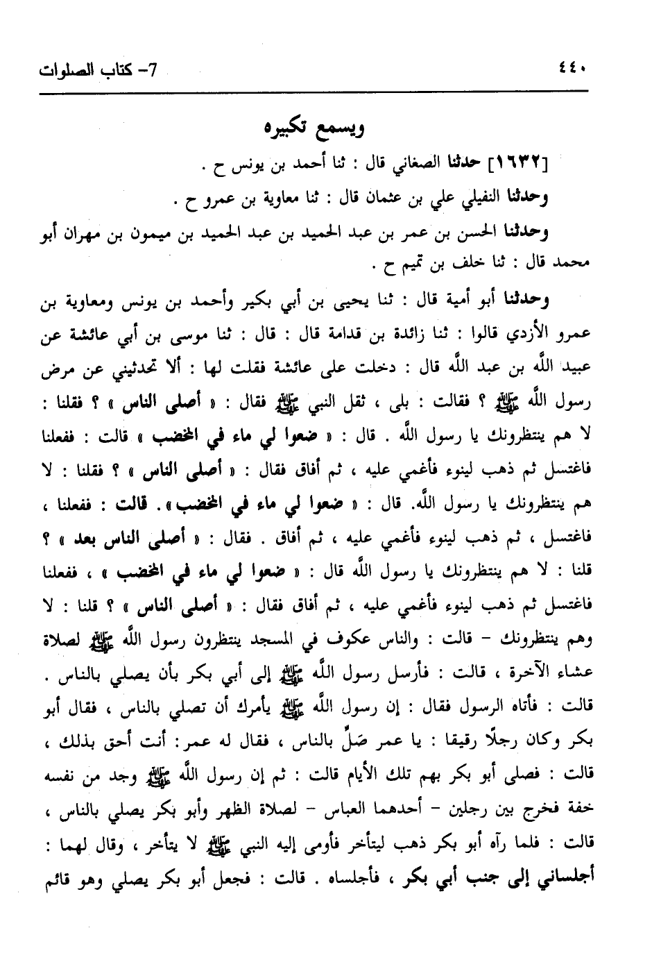 1632 - حَدَّثَنَا الصَّغَانِيُّ قَالَ: ثَنَا أَحْمَدُ بْنُ يُونُسَ، ح. وَحَدَّثَنَا النُّفَيْلِيُّ عَلِيُّ بْنُ عُثْمَانَ قَالَ: ثَنَا مُعَاوِيَةُ بْنُ عَمْرٍو، ح. وَحَدَّثَنَا الْحَسَنُ بْنُ عُمَرَ بْنِ عَبْدِ الْحَمِيدِ بْنِ عَبْدِ الْحَمِيدِ بْنِ مَيْمُونِ بْنِ مِهْرَانَ أَبُو مُحَمَّدٍ قَالَ: ثَنَا خَلَفُ بْنُ تَمِيمٍ، ح. وَحَدَّثَنَا أَبُو أُمَيَّةَ قَالَ: ثَنَا يَحْيَى بْنُ أَبِي بُكَيْرٍ، وَأَحْمَدُ بْنُ يُونُسَ، وَمُعَاوِيَةُ بْنُ عَمْرٍو الْأَزْدِيُّ قَالُوا: ثَنَا زَائِدَةُ بْنُ قُدَامَةَ قَالَ: قَالَ ثَنَا مُوسَى بْنُ أَبِي عَائِشَةَ، عَنْ عُبَيْدِ اللَّهِ بْنِ عَبْدِ اللَّهِ قَالَ: دَخَلْتُ عَلَى عَائِشَةَ فَقُلْتُ لَهَا: أَلَا تُحَدِّثِينِي عَنْ مَرَضِ رَسُولِ اللَّهِ صَلَّى اللهُ عَلَيْهِ وَسَلَّمَ؟ فَقَالَتْ: بَلَى، ثَقُلَ النَّبِيُّ صَلَّى اللهُ عَلَيْهِ وَسَلَّمَ فَقَالَ: «أَصَلَّى النَّاسُ؟» فَقُلْنَا: لَا هُمْ يَنْتَظِرُونَكَ يَا رَسُولَ اللَّهِ، قَالَ: «ضَعُوا لِي مَاءً فِي الْمِخْضَبِ» ، قَالَتْ: فَفَعَلْنَا فَاغْتَسَلَ، ثُمَّ ذَهَبَ لِيَنُوءَ فَأُغْمِيَ عَلَيْهِ، ثُمَّ أَفَاقَ فَقَالَ: «أَصَلَّى النَّاسُ؟» فَقُلْنَا: لَا هُمْ يَنْتَظِرُونَكَ يَا رَسُولَ اللَّهِ، قَالَ: «ضَعُوا لِي مَاءً فِي الْمِخْضَبِ» ، قَالَتْ: فَفَعَلْنَا فَاغْتَسَلَ، ثُمَّ ذَهَبَ لِيَنُوءَ فَأُغْمِيَ عَلَيْهِ، ثُمَّ أَفَاقَ فَقَالَ: «أَصَلَّى النَّاسُ بَعْدُ؟» قُلْنَا: لَا هُمْ يَنْتَظِرُونَكَ يَا رَسُولَ اللَّهِ، قَالَ: «ضَعُوا لِي مَاءً فِي الْمِخْضَبِ» فَفَعَلْنَا، فَاغْتَسَلَ، ثُمَّ ذَهَبَ لِيَنُوءَ فَأُغْمِيَ عَلَيْهِ ثُمَّ أَفَاقَ فَقَالَ: «§أَصَلَّى النَّاسُ؟» قُلْنَا: لَا وَهُمْ يَنْتَظِرُونَكَ، قَالَتْ: وَالنَّاسُ عُكُوفٌ فِي الْمَسْجِدِ يَنْتَظِرُونَ رَسُولَ اللَّهِ صَلَّى اللهُ عَلَيْهِ وَسَلَّمَ لِصَلَاةِ عِشَاءِ الْآخِرَةِ، قَالَتْ: فَأَرْسَلَ رَسُولُ اللَّهِ صَلَّى اللهُ عَلَيْهِ وَسَلَّمَ إِلَى أَبِي بَكْرٍ بِأَنْ يُصَلِّيَ بِالنَّاسِ، قَالَتْ: فَأَتَاهُ الرَّسُولُ فَقَالَ: إِنَّ رَسُولَ اللَّهِ صَلَّى اللهُ عَلَيْهِ وَسَلَّمَ يَأْمُرُكَ أَنْ تُصَلِّيَ بِالنَّاسِ، فَقَالَ أَبُو بَكْرٍ - وَكَانَ رَجُلًا رَقِيقًا -: يَا عُمَرُ صَلِّ بِالنَّاسِ، فَقَالَ لَهُ عُمَرُ: أَنْتَ أَحَقُّ بِذَلِكَ، قَالَتْ: فَصَلَّى أَبُو بَكْرٍ بِهِمْ تِلْكَ الْأَيَّامِ، قَالَتْ: ثُمَّ إِنَّ رَسُولَ اللَّهِ صَلَّى اللهُ عَلَيْهِ وَسَلَّمَ وَجَدَ مِنْ نَفْسِهِ خِفَّةً، فَخَرَجَ بَيْنَ رَجُلَيْنِ: أَحَدُهُمَا الْعَبَّاسُ لِصَلَاةِ الظُّهْرِ، وَأَبُو بَكْرٍ يُصَلِّي بِالنَّاسِ قَالَتْ: فَلَمَّا رَآهُ أَبُو بَكْرٍ ذَهَبَ لِيَتَأَخَّرَ، فَأَوْمَى إِلَيْهِ النَّبِيُّ صَلَّى اللهُ عَلَيْهِ وَسَلَّمَ لَا يَتَأَخَّرَ وَقَالَ لَهُمَا: «أَجْلِسَانِي إِلَى جَنْبِ أَبِي بَكْرٍ» فَأَجْلَسَاهُ، قَالَتْ: فَجَعَلَ أَبُو بَكْرٍ يُصَلِّي وَهُوَ قَائِمٌ -[441]- بِصَلَاةِ النَّبِيِّ صَلَّى اللهُ عَلَيْهِ وَسَلَّمَ وَالنَّاسُ يُصَلُّونَ بِصَلَاةِ أَبِي بَكْرٍ وَالنَّبِيُّ صَلَّى اللهُ عَلَيْهِ وَسَلَّمَ قَاعِدٌ، قَالَ عُبَيْدُ اللَّهِ: فَدَخَلْتُ عَلَى عَبْدِ اللَّهِ بْنِ عَبَّاسٍ فَقُلْتُ لَهُ: أَلَا أَعْرِضُ عَلَيْكَ مَا حَدَّثَتْنِي عَائِشَةُ عَنْ مَرَضِ رَسُولِ اللَّهِ صَلَّى اللهُ عَلَيْهِ وَسَلَّمَ؟ فَقَالَ: هَاتِ، فَعَرَضْتُ حَدِيثَهَا عَلَيْهِ فَمَا أَنْكَرَ مِنْهُ شَيْئًا غَيْرَ أَنَّهُ قَالَ: أَسَمَّتْ لَكَ الرَّجُلَ الْآخَرَ الَّذِي كَانَ مَعَ الْعَبَّاسِ؟ قُلْتُ: لَا، قَالَ: هُوَ عَلِيٌّ. حَدِيثُهُمْ وَاحِدٌ، رَوَاهُ حُسَيْنٌ الْجُعْفِيُّ فَزَادَ كَلِمَاتٍ وَنَقَصَ كَلِمَاتٍ، وَيُقَالُ فِي هَذَ