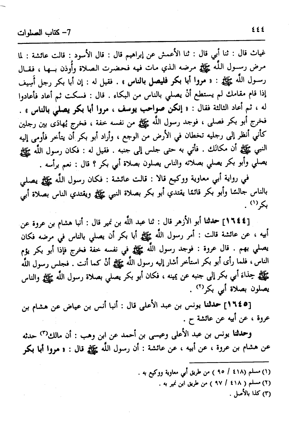 1644 - حَدَّثَنَا أَبُو الْأَزْهَرِ قَالَ: ثَنَا عَبْدُ اللَّهِ بْنُ نُمَيْرٍ قَالَ: أنبا هِشَامُ بْنُ عُرْوَةَ، عَنْ أَبِيهِ، عَنْ عَائِشَةَ قَالَتْ: " §أَمَرَ رَسُولُ اللَّهِ صَلَّى اللهُ عَلَيْهِ وَسَلَّمَ أَبَا بَكْرٍ أَنْ يُصَلِّيَ بِالنَّاسِ فِي مَرَضِهِ، فَكَانَ يُصَلِّي بِهِمْ، قَالَ عُرْوَةُ: فَوَجَدَ رَسُولُ اللَّهِ صَلَّى اللهُ عَلَيْهِ وَسَلَّمَ فِي نَفْسِهِ خِفَّةً فَخَرَجَ فَإِذَا أَبُو بَكْرٍ يَؤُمُّ النَّاسَ، فَلَمَّا رَأَى أَبُو بَكْرٍ اسْتَأْخَرَ أَشَارَ إِلَيْهِ رَسُولُ اللَّهِ صَلَّى اللهُ عَلَيْهِ وَسَلَّمَ أَنْ كَمَا أَنْتَ، فَجَلَسَ رَسُولُ اللَّهِ صَلَّى اللهُ عَلَيْهِ وَسَلَّمَ حِذَاءَ أَبِي بَكْرٍ إِلَى جَنْبِهِ، عَنْ يَمِينِهِ فَكَانَ أَبُو بَكْرٍ يُصَلِّي بِصَلَاةِ رَسُولِ اللَّهِ صَلَّى اللهُ عَلَيْهِ وَسَلَّمَ وَالنَّاسُ يُصَلُّونَ بِصَلَاةِ أَبِي بَكْرٍ "