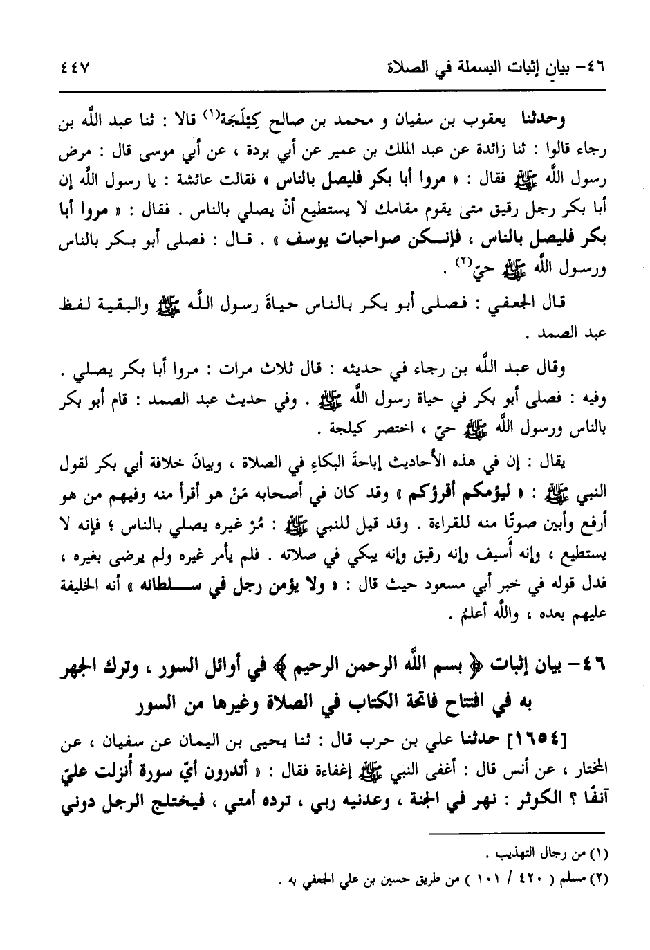 §بَيَانُ إِثْبَاتِ بِسْمِ اللَّهِ الرَّحْمَنِ الرَّحِيمِ فِي أَوَائِلِ السُّوَرِ وَتَرْكِ الْجَهْرِ بِهِ فِي افْتِتَاحِ فَاتِحَةِ الْكِتَابِ فِي الصَّلَاةِ وَغَيْرِهَا مِنَ السُّوَرِ