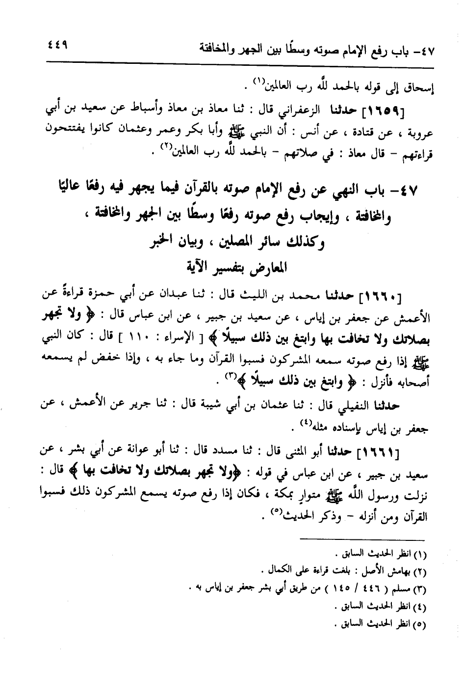 1660 - حَدَّثَنَا مُحَمَّدُ بْنُ اللَّيْثِ قَالَ: ثَنَا عَبْدَانُ، عَنْ أَبِي حَمْزَةَ قِرَاءَةً، عَنِ الْأَعْمَشِ، عَنْ جَعْفَرِ بْنِ إِيَاسٍ، عَنْ سَعِيدِ بْنِ جُبَيْرٍ، عَنِ ابْنِ عَبَّاسٍ قَالَ: " {§وَلَا تَجْهَرْ بِصَلَاتِكَ وَلَا تُخَافِتْ بِهَا وَابْتَغِ بَيْنَ ذَلِكَ سَبِيلًا} [الإسراء: 110] قَالَ: كَانَ النَّبِيُّ صَلَّى اللهُ عَلَيْهِ وَسَلَّمَ إِذَا رَفَعَ صَوْتَهُ سَمِعَهُ الْمُشْرِكُونَ فَسَبُّوا الْقُرْآنَ وَمَا جَاءَ بِهِ، وَإِذَا خَفَضَ لَمْ يَسْمَعْهُ أَصْحَابُهُ، فَأَنْزَلَ {وَابْتَغِ بَيْنَ ذَلِكَ سَبِيلًا} [الإسراء: 110] " حَدَّثَنَا النُّفَيْلِيُّ قَالَ: ثَنَا عُثْمَانُ بْنُ أَبِي شَيْبَةَ قَالَ: ثَنَا جَرِيرٌ، عَنِ الْأَعْمَشِ، عَنْ جَعْفَرِ بْنِ إِيَاسٍ بِإِسْنَادِهِ مِثْلَهُ