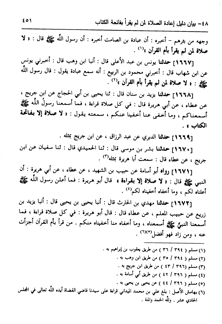 1671 - رَوَاهُ أَبُو أُسَامَةَ، عَنْ حَبِيبِ بْنِ الشَّهِيدِ، عَنْ عَطَاءٍ، عَنْ أَبِي هُرَيْرَةَ، أَنَّ النَّبِيَّ صَلَّى اللهُ عَلَيْهِ وَسَلَّمَ قَالَ: «§لَا صَلَاةَ إِلَّا بِقِرَاءَةٍ» قَالَ أَبُو هُرَيْرَةَ: فَمَا أَعْلَنَ رَسُولُ اللَّهِ صَلَّى اللهُ عَلَيْهِ وَسَلَّمَ أَعْلَنَّاهُ لَكُمْ، وَمَا أَخْفَاهُ أَخْفَيْنَاهُ لَكُمْ