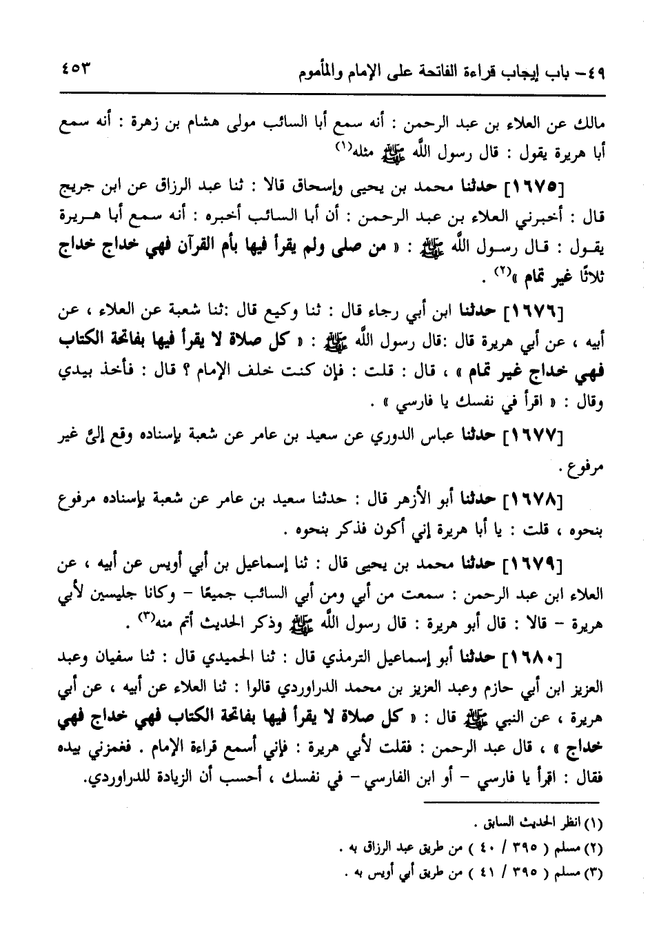 1680 - حَدَّثَنَا أَبُو إِسْمَاعِيلَ التِّرْمِذِيُّ قَالَ: ثَنَا الْحُمَيْدِيُّ قَالَ: ثَنَا سُفْيَانُ، وَعَبْدُ الْعَزِيزِ بْنُ أَبِي حَازِمٍ، وَعَبْدُ الْعَزِيزِ بْنُ مُحَمَّدٍ الدَّرَاوَرْدِيُّ قَالُوا: ثَنَا الْعَلَاءُ، عَنْ أَبِيهِ، عَنْ أَبِي هُرَيْرَةَ، عَنِ النَّبِيِّ صَلَّى اللهُ عَلَيْهِ وَسَلَّمَ قَالَ: «§كُلُّ صَلَاةٍ لَا يُقْرَأُ فِيهَا بِفَاتِحَةِ الْكِتَابِ، فَهِيَ خِدَاجٌ، فَهِيَ خِدَاجً» قَالَ عَبْدُ الرَّحْمَنِ: فَقُلْتُ لِأَبِي هُرَيْرَةَ: فَإِنِّي أَسْمَعُ قِرَاءَةَ الْإِمَامِ فَغَمَزَنِي بِيَدِهِ فَقَالَ: اقْرَأْ يَا فَارِسِيُّ - أَوِ ابْنَ الْفَارِسِيِّ - فِي نَفْسِكَ. أَحْسَبُ أَنَّ الزِّيَادَةَ لِلدَّرَاوَرْدِيِّ