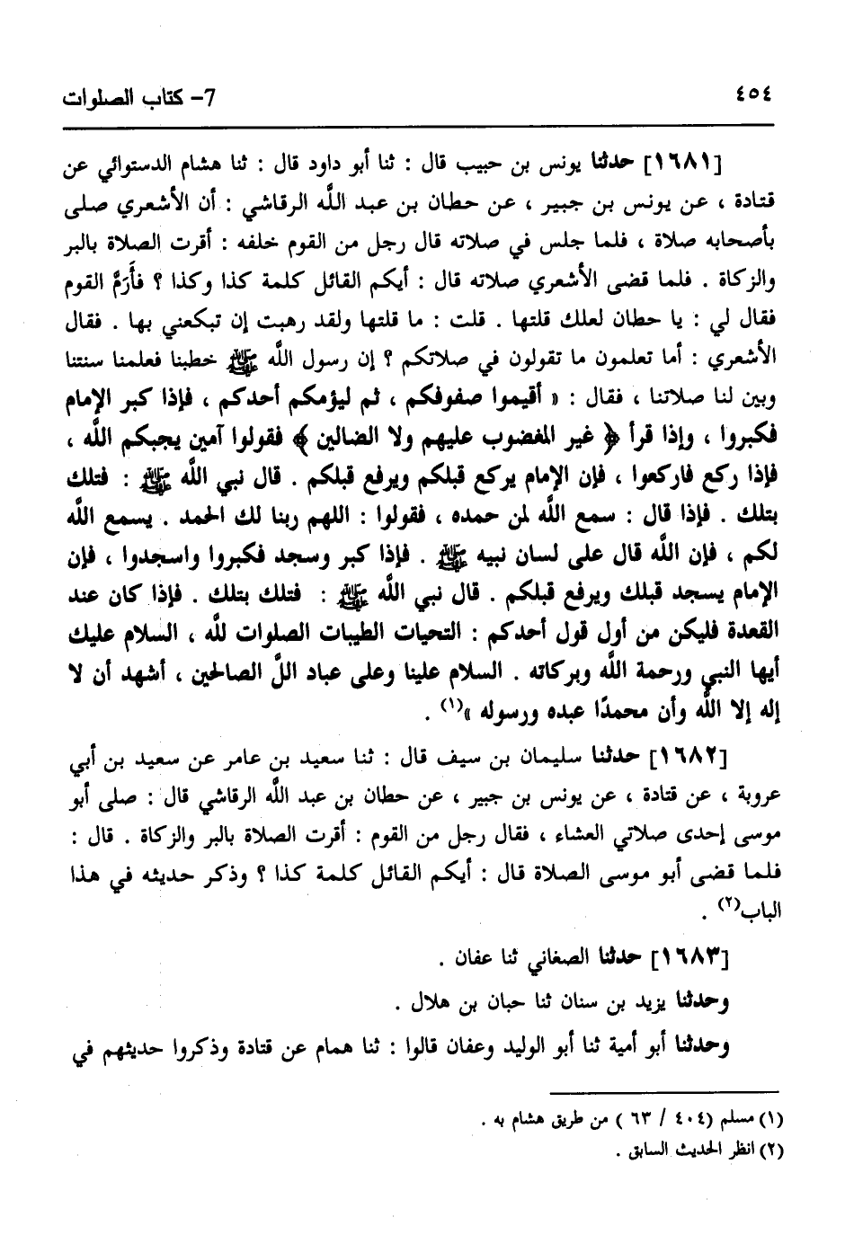1681 - حَدَّثَنَا يُونُسُ بْنُ حَبِيبٍ قَالَ: ثَنَا أَبُو دَاوُدَ قَالَ: ثَنَا هِشَامٌ الدَّسْتُوَائِيُّ، عَنْ قَتَادَةَ، عَنْ يُونُسَ بْنِ جُبَيْرٍ، عَنْ حِطَّانَ بْنِ عَبْدِ اللَّهِ الرَّقَاشِيِّ، أَنَّ الْأَشْعَرِيَّ صَلَّى بِأَصْحَابِهِ صَلَاةً، فَلَمَّا جَلَسَ فِي صَلَاتِهِ قَالَ رَجُلٌ مِنَ الْقَوْمِ خَلْفَهُ: أُقِرَّتِ الصَّلَاةُ بِالْبِرِّ وَالزَّكَاةِ، فَلَمَّا قَضَى الْأَشْعَرِيُّ صَلَاتَهُ قَالَ: أَيُّكُمُ الْقَائِلُ كَلِمَةَ كَذَا وَكَذَا؟ فَأَرَمَّ الْقَوْمُ فَقَالَ لِي: يَا حِطَّانُ لَعَلَّكَ قُلْتَهَا، قُلْتُ: مَا قُلْتُهَا وَلَقَدْ رَهِبْتُ أَنْ تَبْكَعَنِي بِهَا، فَقَالَ الْأَشْعَرِيُّ: أَمَا تَعْلَمُونَ مَا تَقُولُونَ فِي صَلَاتِكُمْ، إِنَّ رَسُولَ اللَّهِ صَلَّى اللهُ عَلَيْهِ وَسَلَّمَ خَطَبَنَا فَعَلَّمَنَا سُنَّتَنَا وَبَيَّنَ لَنَا صَلَاتَنَا فَقَالَ: " §أَقِيمُوا صُفُوفَكُمْ، ثُمَّ لِيَؤُمَّكُمْ أَحَدُكُمْ، فَإِذَا كَبَّرَ الْإِمَامُ فَكَبِّرُوا، وَإِذَا قَرَأَ {غَيْرِ الْمَغْضُوبِ عَلَيْهِمْ وَلَا الضَّالِّينَ} [الفاتحة: 7] فَقُولُوا: آمِينَ يُجِبْكُمُ اللَّهُ، فَإِذَا رَكَعَ فَارْكَعُوا؛ فَإِنَّ الْإِمَامَ يَرْكَعُ قَبْلَكُمْ وَيَرْفَعُ قَبْلَكُمْ «، قَالَ نَبِيُّ اللَّهِ صَلَّى اللهُ عَلَيْهِ وَسَلَّمَ» فَتِلْكَ بِتِلْكَ فَإِذَا قَالَ: سَمِعَ اللَّهُ لِمَنْ حَمِدَهُ فَقُولُوا: اللَّهُمَّ رَبَّنَا لَكَ الْحَمْدُ يَسْمَعُ اللَّهُ لَكُمْ؛ فَإِنَّ اللَّهَ قَالَ عَلَى لِسَانِ نَبِيِّهِ صَلَّى اللهُ عَلَيْهِ وَسَلَّمَ، فَإِذَا كَبَّرَ وَسَجَدَ فَكَبِّرُوا وَاسْجُدُوا؛ فَإِنَّ الْإِمَامَ يَسْجُدُ قَبْلَكَ وَيَرْفَعُ قَبْلَكُمْ "، قَالَ نَبِيُّ اللَّهِ صَلَّى اللهُ عَلَيْهِ وَسَلَّمَ: " فَتِلْكَ بِتِلْكَ فَإِذَا كَانَ عِنْدَ الْقَعْدَةِ فَلْيَكُنْ مِنْ أَوَّلِ قَوْلِ أَحَدِكُمُ: التَّحِيَّاتُ الطَّيِّبَاتُ الصَّلَوَاتُ لِلَّهِ، السَّلَامُ عَلَيْكَ أَيُّهَا النَّبِيُّ وَرَحْمَةُ اللَّهِ وَبَرَكَاتُهُ، السَّلَامُ عَلَيْنَا وَعَلَى عِبَادِ اللَّهِ الصَّالِحِينَ، أَشْهَدُ أَنْ لَا إِلَهَ إِلَّا اللَّهُ، وَأَنَّ مُحَمَّدًا عَبْدُهُ وَرَسُولُهُ "