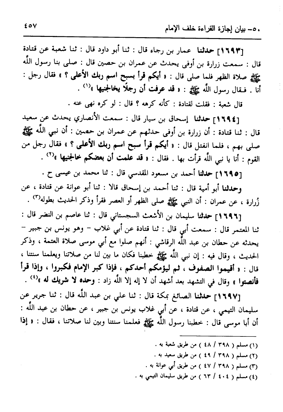 1693 - حَدَّثَنَا عَمَّارُ بْنُ رَجَاءٍ قَالَ: ثَنَا أَبُو دَاوُدَ قَالَ: ثَنَا شُعْبَةُ، عَنْ قَتَادَةَ قَالَ: سَمِعْتُ زُرَارَةَ بْنَ أَوْفَى يُحَدِّثُ، عَنْ عِمْرَانَ بْنِ حُصَيْنٍ قَالَ: صَلَّى بِنَا رَسُولُ اللَّهِ صَلَّى اللهُ عَلَيْهِ وَسَلَّمَ صَلَاةَ الظُّهْرِ، فَلَمَّا صَلَّى قَالَ: «§أَيُّكُمْ قَرَأَ بِسَبِّحِ اسْمَكَ رَبِّكَ الْأَعْلَى؟» فَقَالَ رَجُلٌ: أَنَا، فَقَالَ رَسُولُ اللَّهِ صَلَّى اللهُ عَلَيْهِ وَسَلَّمَ: «قَدْ عَرَفْتُ أَنَّ رَجُلًا يُخَالِجَنِيهَا» قَالَ شُعْبَةُ: فَقُلْتُ لِقَتَادَةَ: كَأَنَّهُ كَرِهَهُ؟ قَالَ: لَوْ كَرِهَ نَهَى عَنْهُ