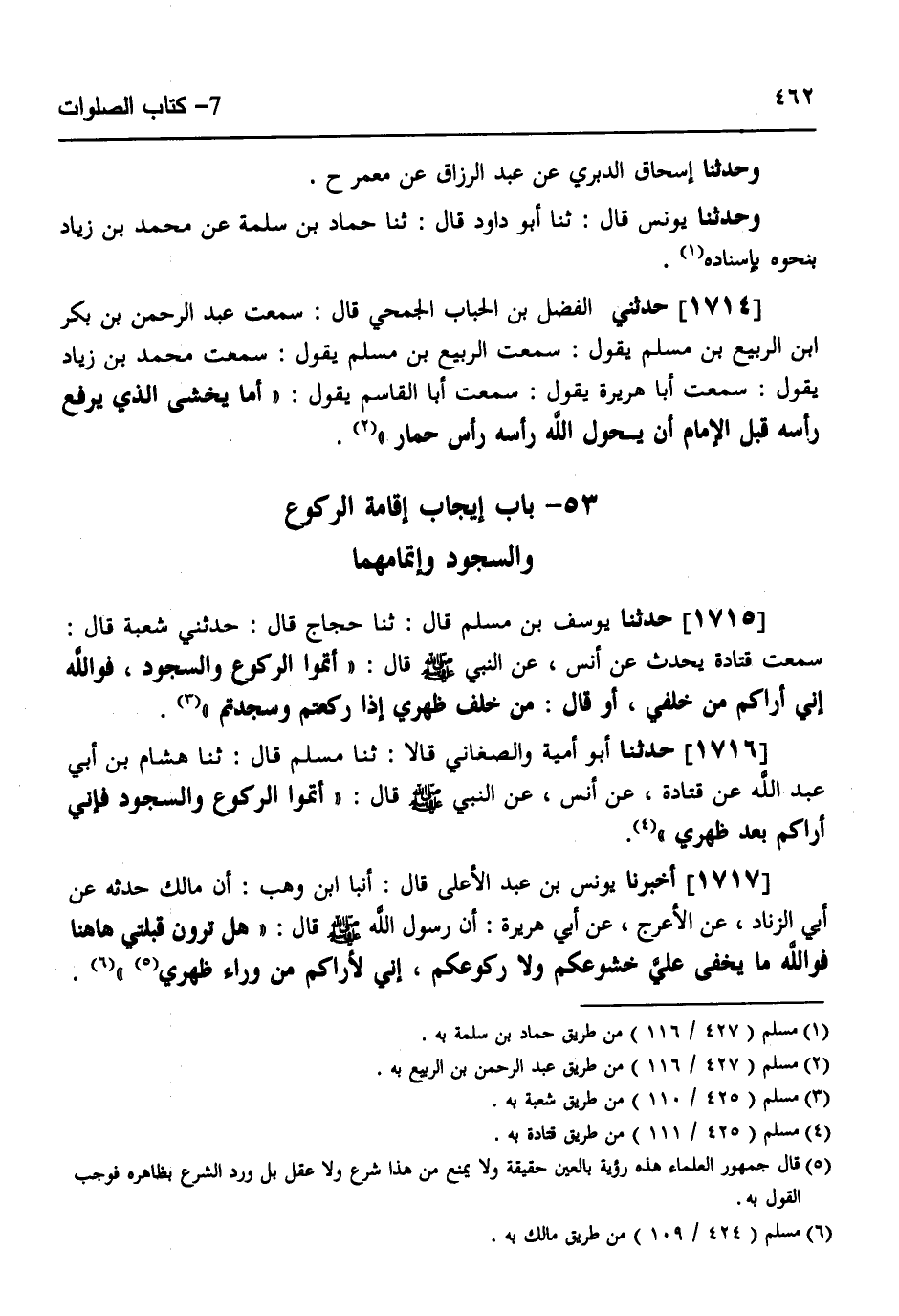 1716 - حَدَّثَنَا أَبُو أُمَيَّةَ، وَالصَّغَانِيُّ قَالَا: ثَنَا مُسْلِمٌ قَالَ: ثَنَا هِشَامُ بْنُ أَبِي عَبْدِ اللَّهِ، عَنْ قَتَادَةَ، عَنْ أَنَسٍ، عَنِ النَّبِيِّ صَلَّى اللهُ عَلَيْهِ وَسَلَّمَ قَالَ: «§أَتِمُّوا الرُّكُوعَ وَالسُّجُودَ؛ فَإِنِّي أَرَاكُمْ بَعْدَ ظَهْرِي»