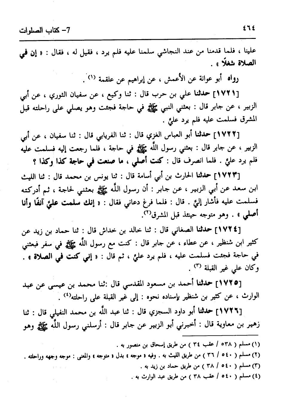 1724 - حَدَّثَنَا الصَّغَانِيُّ قَالَ: ثَنَا خَالِدُ بْنُ خِدَاشٍ قَالَ: ثَنَا حَمَّادُ بْنُ زَيْدٍ، عَنْ كَثِيرِ بْنِ شِنْظِيرٍ، عَنْ عَطَاءٍ، عَنْ جَابِرٍ قَالَ: " كُنْتُ مَعَ رَسُولِ اللَّهِ صَلَّى اللهُ عَلَيْهِ وَسَلَّمَ فِي سَفَرٍ فَبَعَثَنِي فِي حَاجَةٍ §فَجِئْتُ فَسَلَّمْتُ عَلَيْهِ فَلَمْ يَرُدَّ عَلَيَّ، ثُمَّ قَالَ: «إِنِّي كُنْتُ فِي الصَّلَاةِ» وَكَانَ عَلَى غَيْرِ الْقِبْلَةِ.