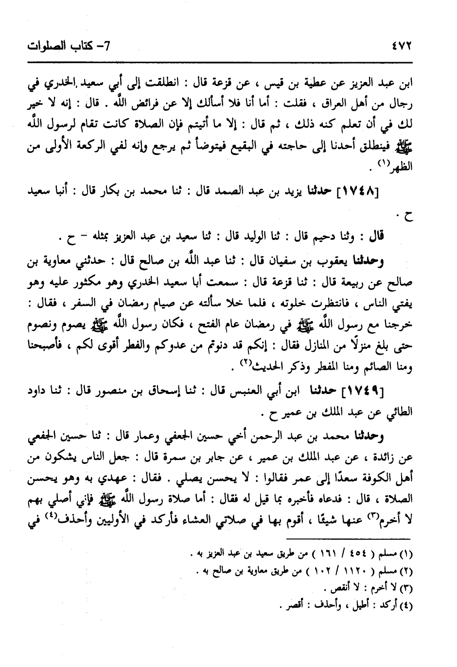 1748 - حَدَّثَنَا يَزِيدُ بْنُ عَبْدِ الصَّمَدِ قَالَ: ثَنَا مُحَمَّدُ بْنُ بَكَّارٍ قَالَ: أَنْبَا سَعِيدٌ، ح. قَالَ: وَثَنَا دُحَيْمٌ قَالَ: ثَنَا الْوَلِيدُ قَالَ: ثَنَا سَعِيدُ بْنُ عَبْدِ الْعَزِيزِ، بِمِثْلِهِ ح. وَحَدَّثَنَا يَعْقُوبُ بْنُ سُفْيَانَ قَالَ: ثَنَا عَبْدُ اللَّهِ بْنُ صَالِحٍ قَالَ: حَدَّثَنِي مُعَاوِيَةُ بْنُ صَالِحٍ، عَنْ رَبِيعَةَ قَالَ: ثَنَا قَزَعَةُ قَالَ: سَمِعْتُ أَبَا سَعِيدٍ الْخُدْرِيِّ وَهُوَ مَكْثُورٌ عَلَيْهِ وَهُوَ يُفْتِي النَّاسَ فَانْتَظَرْتُ خَلْوَتَهُ، فَلَمَّا خَلَا سَأَلْتُهُ عَنْ صِيَامِ رَمَضَانَ فِي السَّفَرِ، فَقَالَ: خَرَجْنَا مَعَ رَسُولِ اللَّهِ صَلَّى اللهُ عَلَيْهِ وَسَلَّمَ فِي رَمَضَانَ عَامَ الْفَتْحِ، فَكَانَ رَسُولُ اللَّهِ صَلَّى اللهُ عَلَيْهِ وَسَلَّمَ يَصُومُ وَنَصُومُ حَتَّى بَلَغَ مَنْزِلًا مِنَ الْمَنَازِلِ فَقَالَ: «§إِنَّكُمْ قَدْ دَنَوْتُمْ مِنْ عَدُوِّكُمْ وَالْفِطْرُ أَقْوَى لَكُمْ» فَأَصْبَحْنَا وَمِنَّا الصَّائِمُ وَمِنَّا الْمُفْطِرُ وَذَكَرَ الْحَدِيثَ