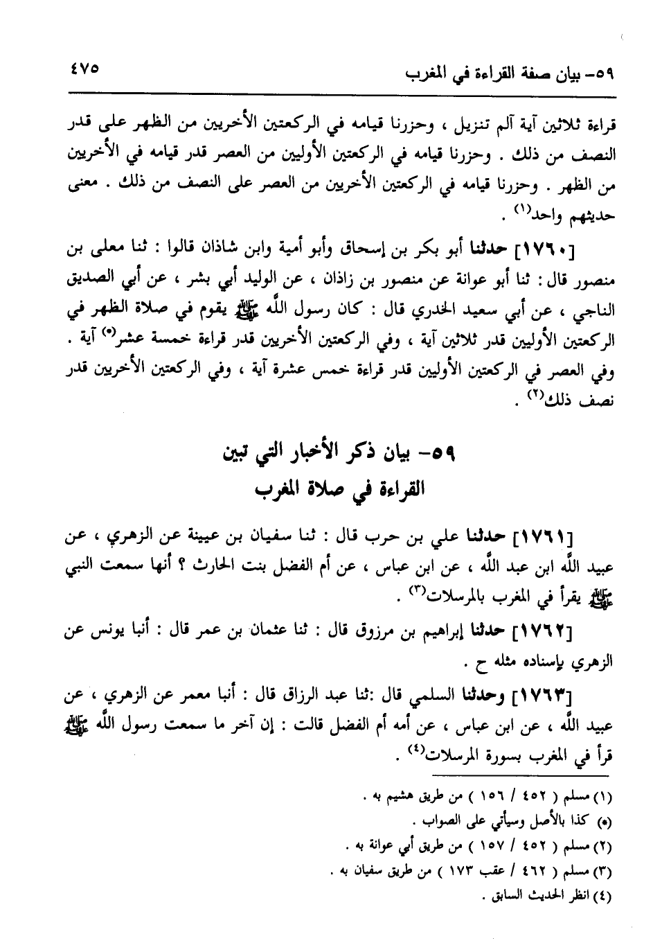 1761 - حَدَّثَنَا عَلِيُّ بْنُ حَرْبٍ قَالَ: ثَنَا سُفْيَانُ بْنُ عُيَيْنَةَ، عَنِ الزُّهْرِيِّ، عَنْ عُبَيْدِ اللَّهِ بْنِ عَبْدِ اللَّهِ، عَنِ ابْنِ عَبَّاسٍ، عَنْ أُمِّ الْفَضْلِ بِنْتِ الْحَارِثِ أَنَّهَا قَالَتْ: «سَمِعْتُ النَّبِيَّ صَلَّى اللهُ عَلَيْهِ وَسَلَّمَ §يَقْرَأُ فِي الْمَغْرِبِ بِالْمُرْسَلَاتِ»