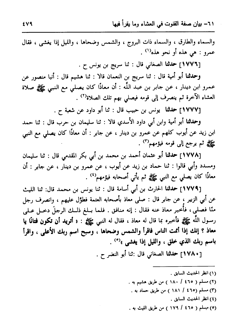 1776 - حَدَّثَنَا الصَّغَانِيُّ قَالَ: ثَنَا سُرَيْجُ بْنُ يُونُسَ، ح. وَحَدَّثَنَا أَبُو أُمَيَّةَ قَالَ: ثَنَا سُرَيْجُ بْنُ النُّعْمَانِ قَالَا: ثَنَا هُشَيْمٌ قَالَ: أَنْبَا مَنْصُورٌ، عَنْ عَمْرِو بْنِ دِينَارٍ، عَنْ جَابِرِ بْنِ عَبْدِ اللَّهِ، «أَنَّ مُعَاذًا كَانَ §يُصَلِّي مَعَ النَّبِيِّ صَلَّى اللهُ عَلَيْهِ وَسَلَّمَ صَلَاةَ الْعِشَاءِ الْآخِرَةِ، ثُمَّ يَنْصَرِفُ إِلَى قَوْمِهِ فَيُصَلِّي بِهِمْ تِلْكَ الصَّلَاةِ»