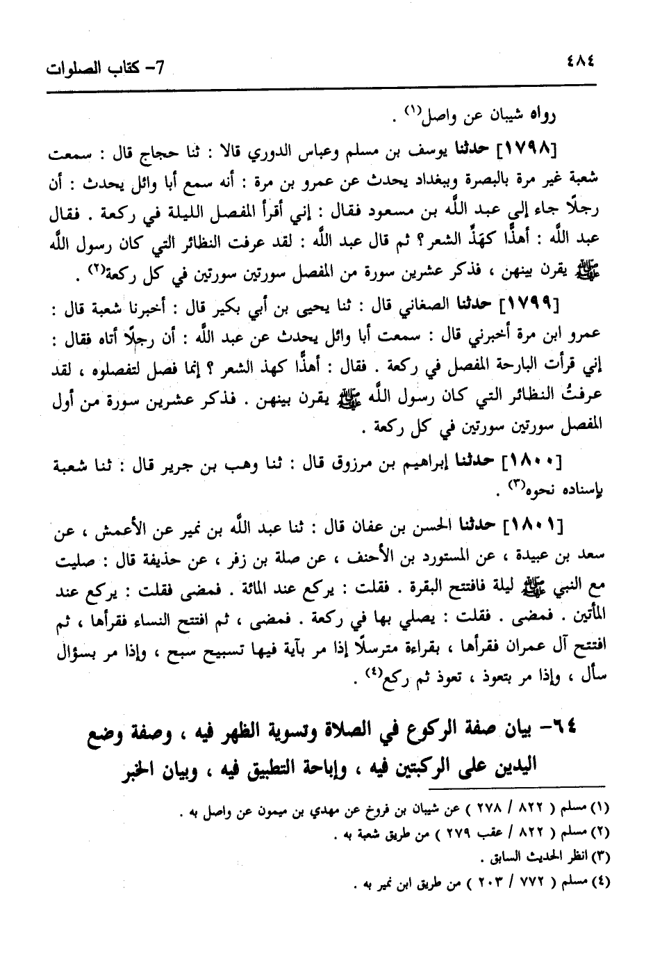 1798 - حَدَّثَنَا يُوسُفُ بْنُ مُسْلِمٍ، وَعَبَّاسٌ الدُّورِيُّ قَالَا: ثَنَا حَجَّاجٌ قَالَ: سَمِعْتُ شُعْبَةَ غَيْرَ مَرَّةٍ بِالْبَصْرَةِ وَبِبَغْدَادَ يُحَدِّثُ عَنْ عَمْرِو بْنِ مُرَّةَ، أَنَّهُ سَمِعَ أَبَا وَائِلٍ يُحَدِّثُ، أَنَّ رَجُلًا جَاءَ إِلَى عَبْدِ اللَّهِ بْنِ مَسْعُودٍ فَقَالَ: إِنِّي أَقْرَأُ الْمُفَصَّلَ اللَّيْلَةَ فِي رَكْعَةٍ، فَقَالَ عَبْدُ اللَّهِ: أَهَذًّا كَهَذِّ الشِّعْرِ؟ ثُمَّ قَالَ عَبْدُ اللَّهِ: «لَقَدْ عَرَفْتُ §النَّظَائِرَ الَّتِي كَانَ رَسُولُ اللَّهِ صَلَّى اللهُ عَلَيْهِ وَسَلَّمَ يَقْرِنُ بَيْنَهُنَّ، فَذَكَرَ عِشْرِينَ سُورَةً مِنَ الْمُفَصَّلِ سُورَتَيْنِ سُورَتَيْنِ فِي كُلِّ رَكْعَةٍ»