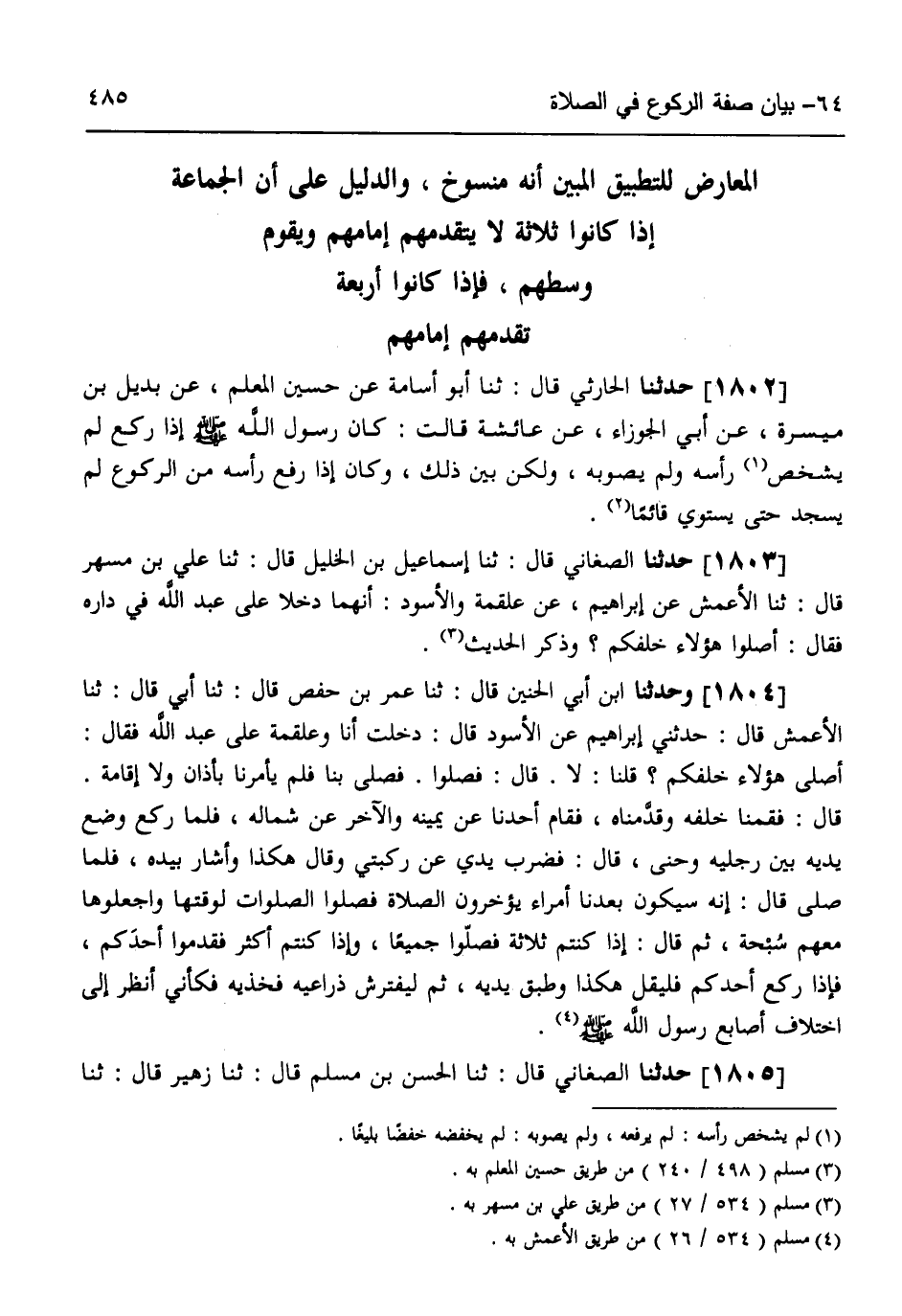1805 - حَدَّثَنَا الصَّغَانِيُّ قَالَ: ثَنَا الْحَسَنُ بْنُ مُسْلِمٍ قَالَ: ثَنَا زُهَيْرٌ قَالَ: ثَنَا -[486]- سُلَيْمَانُ، عَنْ إِبْرَاهِيمَ قَالَ: دَخَلَ عَلْقَمَةُ، وَالْأَسْوَدُ عَلَى عَبْدِ اللَّهِ قَالَ: فَقَالَ: " أَصَلَّى هَؤُلَاءِ مِنْ وَرَائِكُمْ؟ قُلْنَا: لَا، قَالَ: قُومُوا فَصَلُّوا، قَالَ: فَلَمْ يَأْمُرْنَا بِأَذَانٍ وَلَا بِإِقَامَةٍ، فَذَهَبْنَا نَتَأَخَّرُ فَأَخَذَ بِأَيْدِينَا فَأَقَامَنَا مَعَهُ، فَلَمَّا رَكَعَ وَضَعَ الْأَسْوَدُ يَدَيْهِ عَلَى رُكْبَتَيْهِ، قَالَ: فَنَظَرَ عَبْدُ اللَّهِ فَأَبْصَرَهُ، قَالَ: فَضَرَبَ يَدَيْهِ فَنَظَرَ الْأَسْوَدُ فَإِذَا يَدَيْ عَبْدِ اللَّهِ بَيْنَ رُكْبَتَيْهِ وَقَدْ خَالَفَ بَيْنَ أَصَابِعِهِ " فَلَمَّا قَضَى الصَّلَاةَ قَالَ: «§إِذَا كُنْتُمْ ثَلَاثَةً فَصَلُّوا جَمِيعًا، وَإِذَا كُنْتُمْ أَكْثَرَ مِنْ ذَلِكَ فَلْيَؤُمَّكُمْ أَحَدُكُمْ، وَإِذَا رَكَعْتَ فَافْرِشْ ذِرَاعَيْكَ فَخِذَيْكَ» فَلَكَأَنِّي أَنْظُرُ إِلَى اخْتِلَافِ أَصَابِعِ رَسُولِ اللَّهِ صَلَّى اللهُ عَلَيْهِ وَسَلَّمَ وَهُوَ رَاكِعٌ رَوَى عَلِيُّ بْنُ حَرْبٍ، عَنْ أَبِي مُعَاوِيَةَ، عَنِ الْأَعْمَشِ، عَنْ إِبْرَاهِيمَ، عَنِ الْأَسْوَدِ، وَعَلْقَمَةَ قَالَ: أَتَيْنَا عَبْدَ اللَّهِ بْنَ مَسْعُودٍ فِي دَارِهِ، فَقَالَ: أَصَلَّى هَؤُلَاءِ خَلْفَكُمْ؟ وَذَكَرَ الْحَدِيثَ. رَوَى عِيسَى بْنُ يُونُسَ، عَنِ الْأَعْمَشِ، عَنْ إِبْرَاهِيمَ، عَنِ الْأَسْوَدِ، عَنْ عَبْدِ اللَّهِ، وَطَبَّقَ بَيْنَ كَفَّيْهِ
