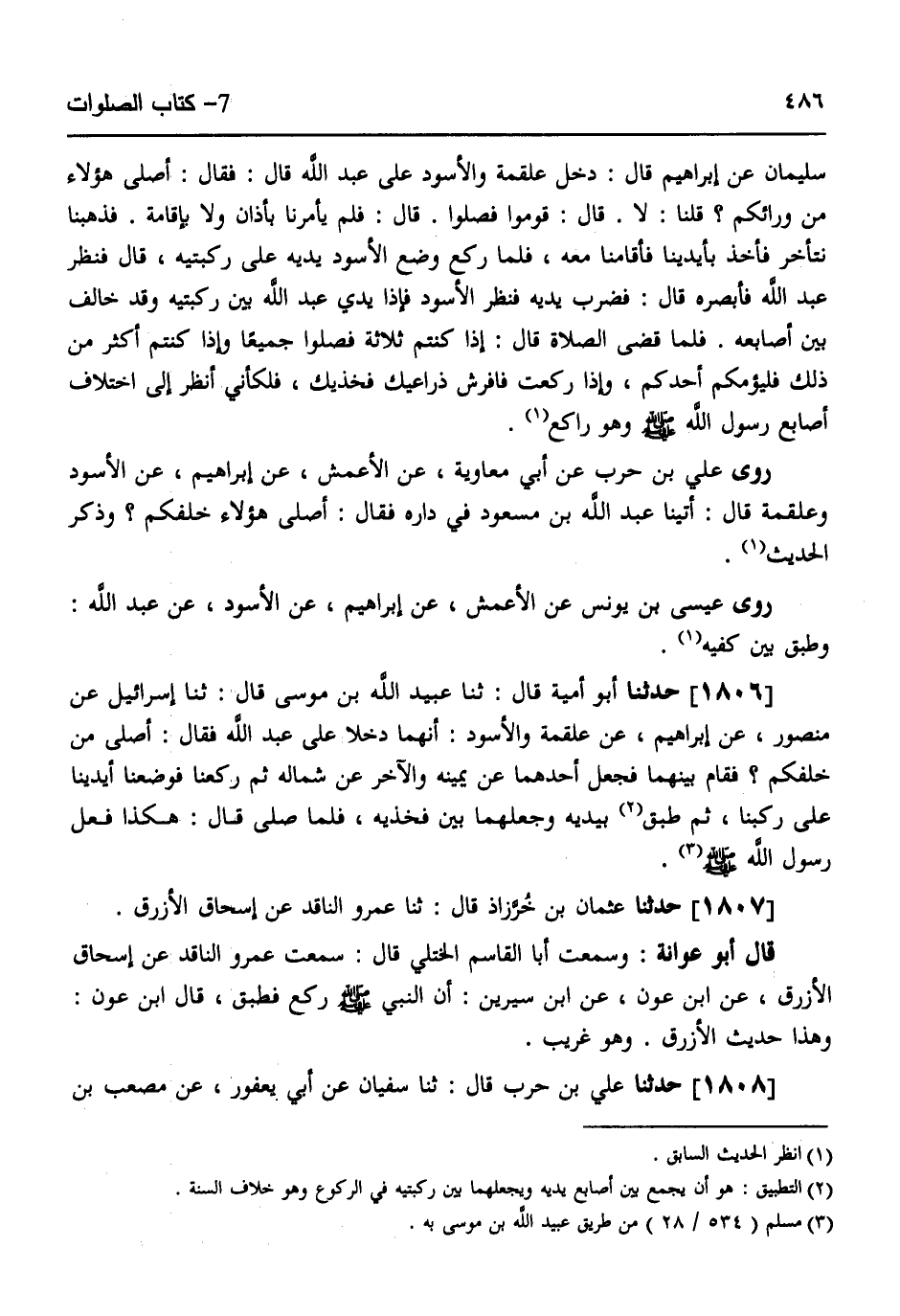 1806 - حَدَّثَنَا أَبُو أُمَيَّةَ قَالَ: ثَنَا عُبَيْدُ اللَّهِ بْنُ مُوسَى قَالَ: ثَنَا إِسْرَائِيلُ، عَنْ مَنْصُورٍ، عَنْ إِبْرَاهِيمَ، عَنْ عَلْقَمَةَ، وَالْأَسْوَدِ أَنَّهُمَا دَخَلَا عَلَى عَبْدِ اللَّهِ فَقَالَ: " §أَصَلَّى مَنْ خَلْفَكُمْ؟ فَقَامَ بَيْنَهُمَا فَجَعَلَ أَحَدَهُمَا عَنْ يَمِينِهِ، وَالْآخَرَ عَنْ شِمَالِهِ، ثُمَّ رَكَعْنَا فَوَضَعْنَا أَيْدِينَا عَلَى رُكَبِنَا، ثُمَّ طَبَّقَ بِيَدَيْهِ وَجَعَلَهُمَا بَيْنَ فَخِذَيْهِ، فَلَمَّا صَلَّى قَالَ: هَكَذَا فَعَلَ رَسُولُ اللَّهِ صَلَّى اللهُ عَلَيْهِ وَسَلَّمَ "