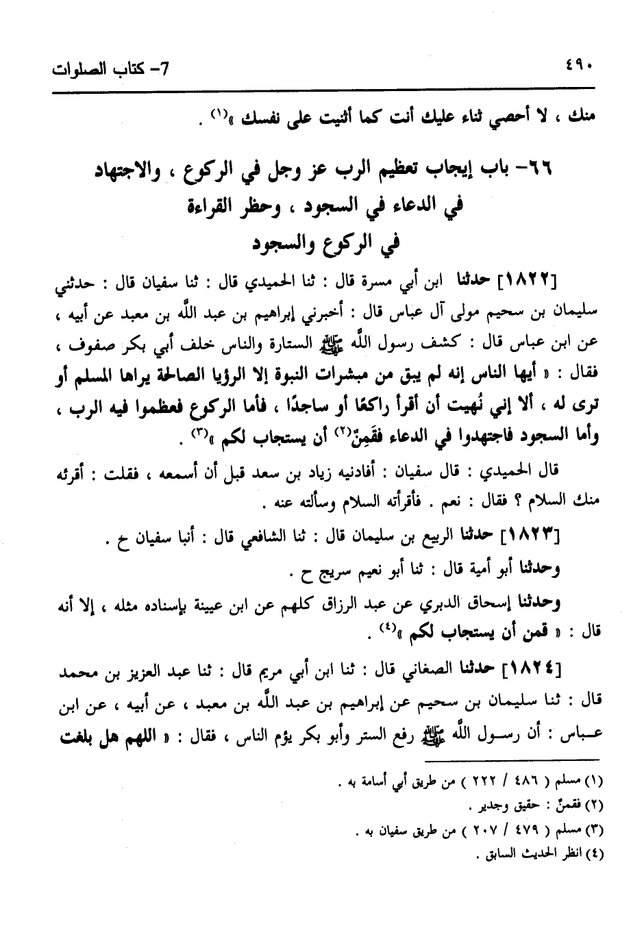 1822 - حَدَّثَنَا ابْنُ أَبِي مَسَرَّةَ قَالَ: ثَنَا الْحُمَيْدِيُّ قَالَ: ثَنَا سُفْيَانُ قَالَ: حَدَّثَنِي سُلَيْمَانُ بْنُ سُحَيْمٍ مَوْلَى آلِ عَبَّاسٍ قَالَ: أَخْبَرَنِي إِبْرَاهِيمُ بْنُ عَبْدِ اللَّهِ بْنِ مَعْبَدٍ، عَنْ أَبِيهِ، عَنِ ابْنِ عَبَّاسٍ قَالَ: كَشَفَ رَسُولُ اللَّهِ صَلَّى اللهُ عَلَيْهِ وَسَلَّمَ السِّتَارَةَ وَالنَّاسُ خَلْفَ أَبِي بَكْرٍ صُفُوفٌ فَقَالَ: «أَيُّهَا النَّاسُ إِنَّهُ §لَمْ يَبْقَ مِنْ مُبَشِّرَاتِ النُّبُوَّةِ إِلَّا الرُّؤْيَا الصَّالِحَةُ يَرَاهَا الْمُسْلِمُ أَوْ تُرَى لَهُ، أَلَا إِنِّي نُهِيتُ أَنْ أَقْرَأَ رَاكِعًا أَوْ سَاجِدًا، فَأَمَّا الرُّكُوعُ فَعَظِّمُوا فِيهِ الرَّبَّ، وَأَمَّا السُّجُودُ فَاجْتَهِدُوا فِي الدُّعَاءِ فَقَمِنٌ أَنْ يُسْتَجَابَ لَكُمْ» قَالَ الْحُمَيْدِيُّ: قَالَ سُفْيَانُ: أَفَادَنِيهِ زِيَادُ بْنُ سَعْدٍ قَبْلَ أَنْ أَسْمَعَهُ، فَقُلْتُ: أَقْرِئْهُ مِنْكَ سَلَامٌ فَقَالَ: نَعَمْ فَأَقْرَأْتُهُ السَّلَامَ وَسَأَلْتُهُ عَنْهُ.
