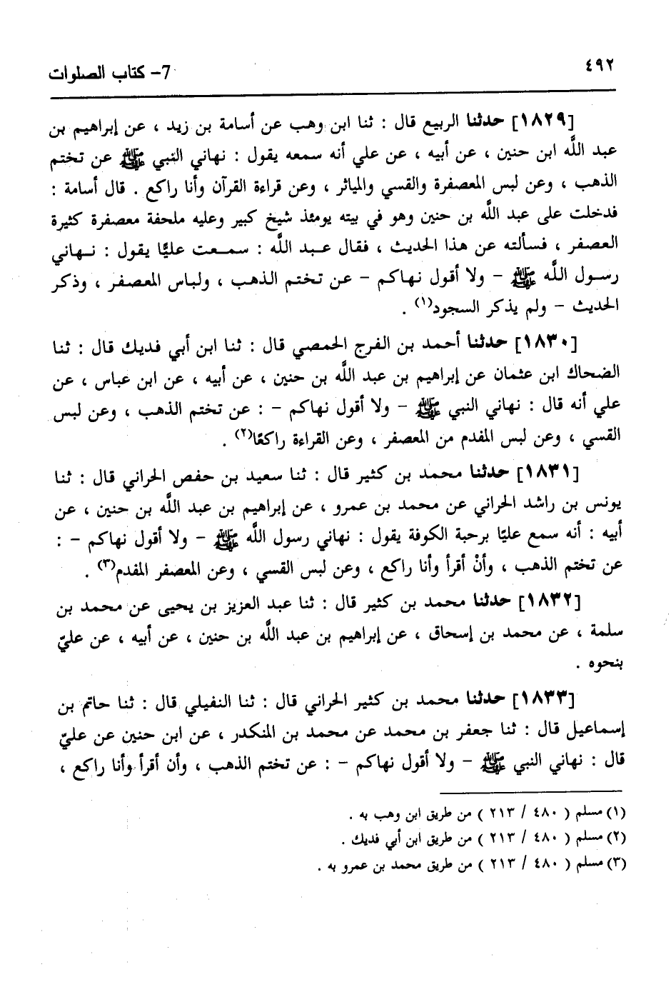 1833- حَدَّثَنَا مُحَمَّدُ بْنُ كَثِيرٍ الْحَرَّانِيُّ ، قَالَ : حَدَّثَنَا النُّفَيْلِيُّ ، قَالَ : حَدَّثَنَا حَاتِمُ بْنُ إِسْمَاعِيلَ ، قَالَ : حَدَّثَنَا جَعْفَرُ بْنُ مُحَمَّدٍ ، عَنْ مُحَمَّدِ بْنِ الْمُنْكَدِرِ ، عَنِ ابْنِ حُنَيْنٍ ، عَنْ عَلِيّ ، قَالَ : نَهَانِي النَّبِيُّ صَلَّى اللهُ عَلَيهِ وَسَلَّمَ وَلاَ أَقُولُ نَهَاكُمْ عَنْ تَخَتُّمِ الذَّهَبِ ، وَأَنْ أَقْرَأَ وَأَنَا رَاكِعٌ ، وَعَنْ لُبْسِ الْقَسِّيِّ ، وَعَنِ الْمُعَصْفَرِ الْمُفَدَّمِ ، مِثْلَهُ وَلَمْ يَذْكُرِ السُّجُودَ.