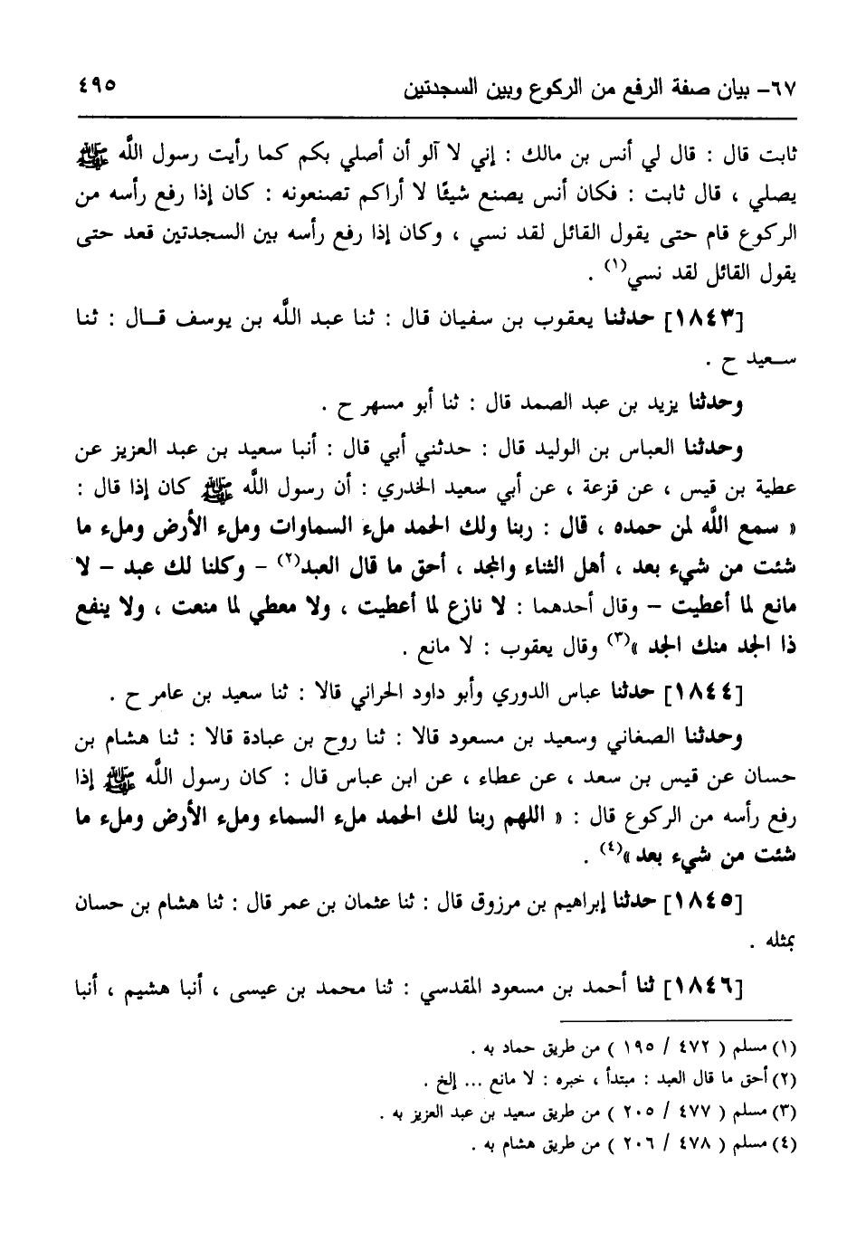 1843 - حَدَّثَنَا يَعْقُوبُ بْنُ سُفْيَانَ قَالَ: ثَنَا عَبْدُ اللَّهِ بْنُ يُوسُفَ قَالَ: ثَنَا سَعِيدٌ، ح. وَحَدَّثَنَا يَزِيدُ بْنُ عَبْدِ الصَّمَدِ قَالَ: ثَنَا أَبُو مُسْهِرٍ، ح. وَحَدَّثَنَا الْعَبَّاسُ بْنُ الْوَلِيدِ قَالَ: حَدَّثَنِي أَبِي قَالَ: أنبا سَعِيدُ بْنُ عَبْدِ الْعَزِيزِ، عَنْ عَطِيَّةَ بْنِ قَيْسٍ، عَنْ قَزَعَةَ، عَنْ أَبِي سَعِيدٍ الْخُدْرِيِّ، أَنَّ رَسُولَ اللَّهِ صَلَّى اللهُ عَلَيْهِ وَسَلَّمَ " §كَانَ إِذَا قَالَ سَمِعَ اللَّهُ لِمَنْ حَمِدَهُ قَالَ: " رَبَّنَا وَلَكَ الْحَمْدُ مِلْءَ السَّمَاوَاتِ وَمِلْءَ الْأَرْضِ وَمِلْءَ مَا شِئْتَ مِنْ شَيْءٍ بَعْدُ، أَهْلَ الثَّنَاءِ وَالْمَجْدِ أَحَقُّ مَا قَالَ الْعَبْدُ وَكُلُّنَا لَكَ عَبْدٌ، لَا مَانِعَ لِمَا أَعْطَيْتَ - وَقَالَ أَحَدُهُمَا: لَا نَازَعَ لِمَا أَعْطَيْتَ - وَلَا مُعْطِيَ لِمَا مَنَعْتَ وَلَا يَنْفَعُ ذَا الْجَدِّ مِنْكَ الْجَدُّ " وَقَالَ يَعْقُوبُ: لَا مَانِعَ