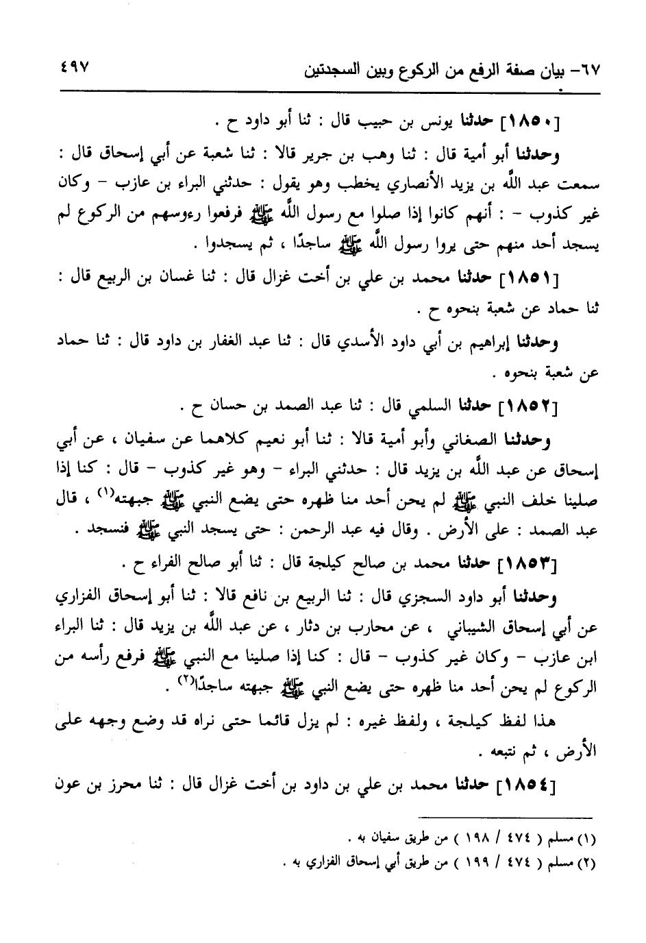 1853 - حَدَّثَنَا مُحَمَّدُ بْنُ صَالِحٍ كَيْلَجَةُ قَالَ: ثَنَا أَبُو صَالِحٍ الْفَرَّاءُ، ح. وَحَدَّثَنَا أَبُو دَاوُدَ السِّجْزِيُّ قَالَ: ثَنَا الرَّبِيعُ بْنُ نَافِعٍ قَالَا: ثَنَا أَبُو إِسْحَاقَ الْفَزَارِيُّ، عَنْ أَبِي إِسْحَاقَ الشَّيْبَانِيِّ، عَنْ مُحَارِبِ بْنِ دِثَارٍ، عَنْ عَبْدِ اللهِ بْنِ يَزِيدَ قَالَ: ثَنَا الْبَرَاءُ بْنُ عَازِبٍ، وَكَانَ غَيْرَ كَذُوبٍ قَالَ: «§كُنَّا إِذَا صَلَّيْنَا مَعَ النَّبِيِّ صَلَّى اللهُ عَلَيْهِ وَسَلَّمَ فَرَفَعَ رَأْسَهُ مِنَ الرُّكُوعِ لَمْ يَحْنِ أَحَدٌ مِنَّا ظَهْرَهُ حَتَّى يَضَعَ النَّبِيُّ صَلَّى اللهُ عَلَيْهِ وَسَلَّمَ جَبْهَتَهُ سَاجِدًا» هَذَا لَفْظُ كَيْلَجَةَ وَلَفْظُ غَيْرِهِ لَمْ يَزَلْ قَائِمًا حَتَّى نَرَاهُ قَدْ وَضَعَ وَجْهَهُ عَلَى الْأَرْضِ، ثُمَّ نَتَّبِعُهُ